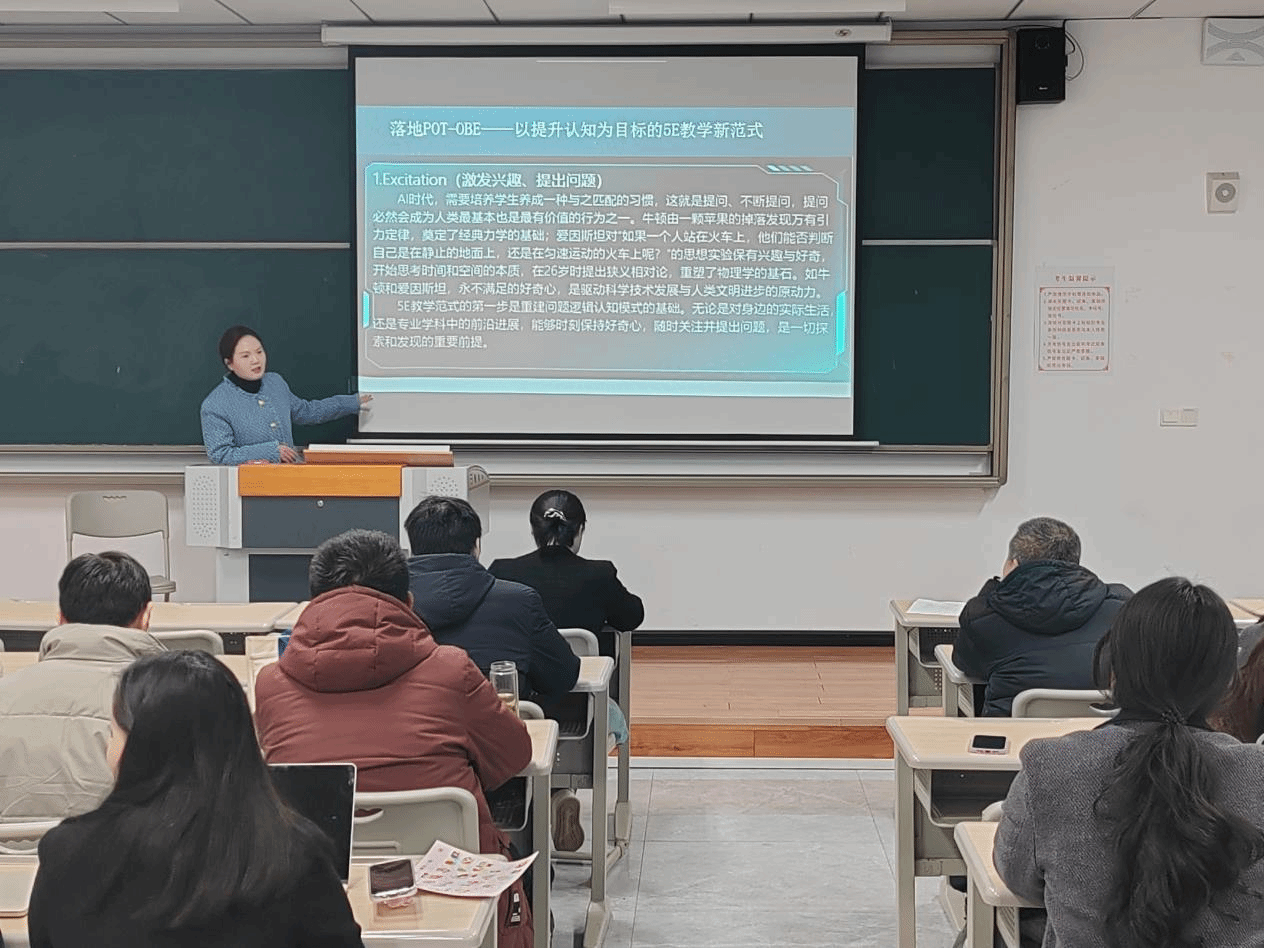 然后,冉老师结合自身教学实践进行分享。在参加相关培训后,她率先将POT-OBE教育理念与5E教学新范式融入日常教学中。以《欧洲文明的现代历程》课程为例,首先利用历史学科丰富的教学素材激发学生兴趣、提出问题,接着教学生透过现象看本质并制定解决方案,推动学生实践解决问题,最后引导学生反思问题分析过程与结果。通过实践发现,这种教学方式能够有效激发学生的学习兴趣,对培养学生的批判性思维与创新能力有显著帮助作用。在课堂上,学生们不再是被动的知识接受者,而是积极的信息加工者,通过与AI的协同合作,不断拓展思维,提升解决实际问题的能力。