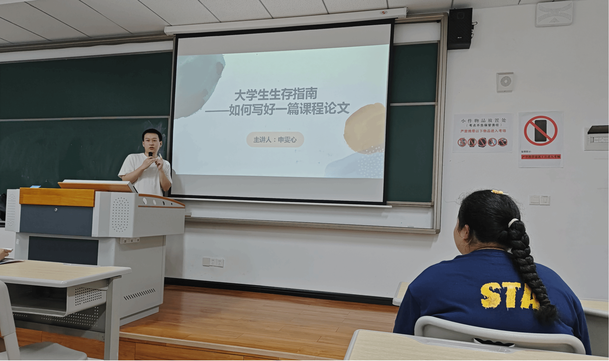 其次,申老师针对论文的格式与撰写技巧与同学们进行了交流分享,一篇严谨的大学课程论文应当做到“有头有尾”且排版美观干净。为了让同学们更好地感受到课程论文的撰写过程,申老师还结合往届学长学姐们的优秀论文素材进行案例解析,同学们能够更直观的了解到一篇合格的论文应当是怎样构成的。