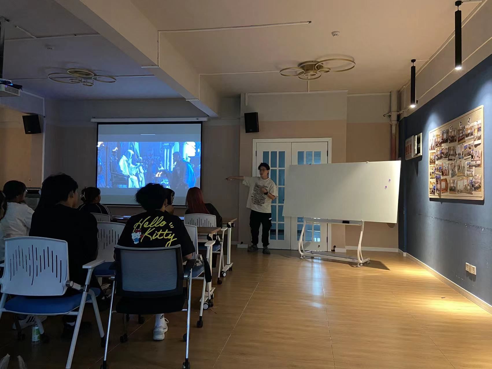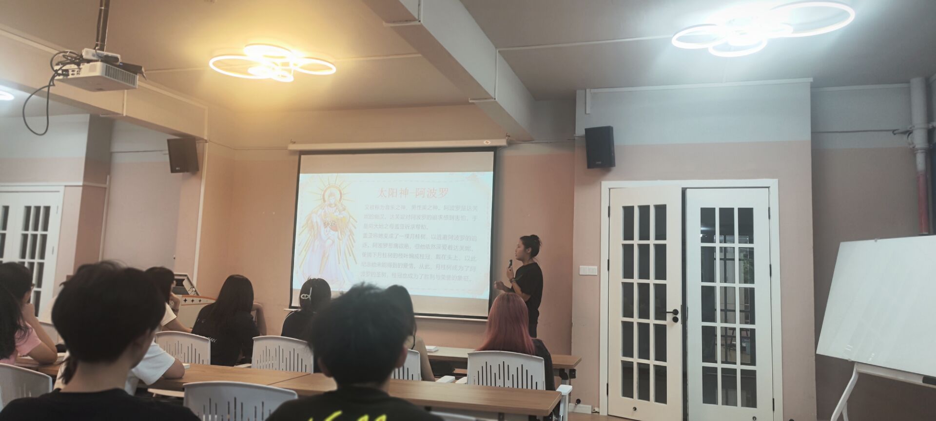随后,甄白灵老师接过话题,将学生们的视线从画面引向更深层次的文化与历史。她首先介绍了欧洲中世纪的社会背景、宗教环境以及政治格局,为学生们构建了一个宏大的历史框架。甄老师结合《天国王朝》的剧情,生动地讲述了欧洲中世纪的历史风情以及古希腊神话故事对影片情节的潜在影响。随后,甄老师结合影片中的具体情节,对影片中的某些象征性元素进行了深入的剖析。同学们都被她讲述的阿波罗与达芙妮的故事所吸引,大家还就中西方神话以及中西方文明的不同点展开了热烈的讨论。有学生提到,甄老师的讲解让自己对电影产生了新的认识,不再仅仅将其视为一种娱乐方式,而是看作一种文化传承和交流的媒介。甄老师的讲解不仅拓宽了学生的知识面,更激发了他们对欧洲文明探索的兴趣与热情。