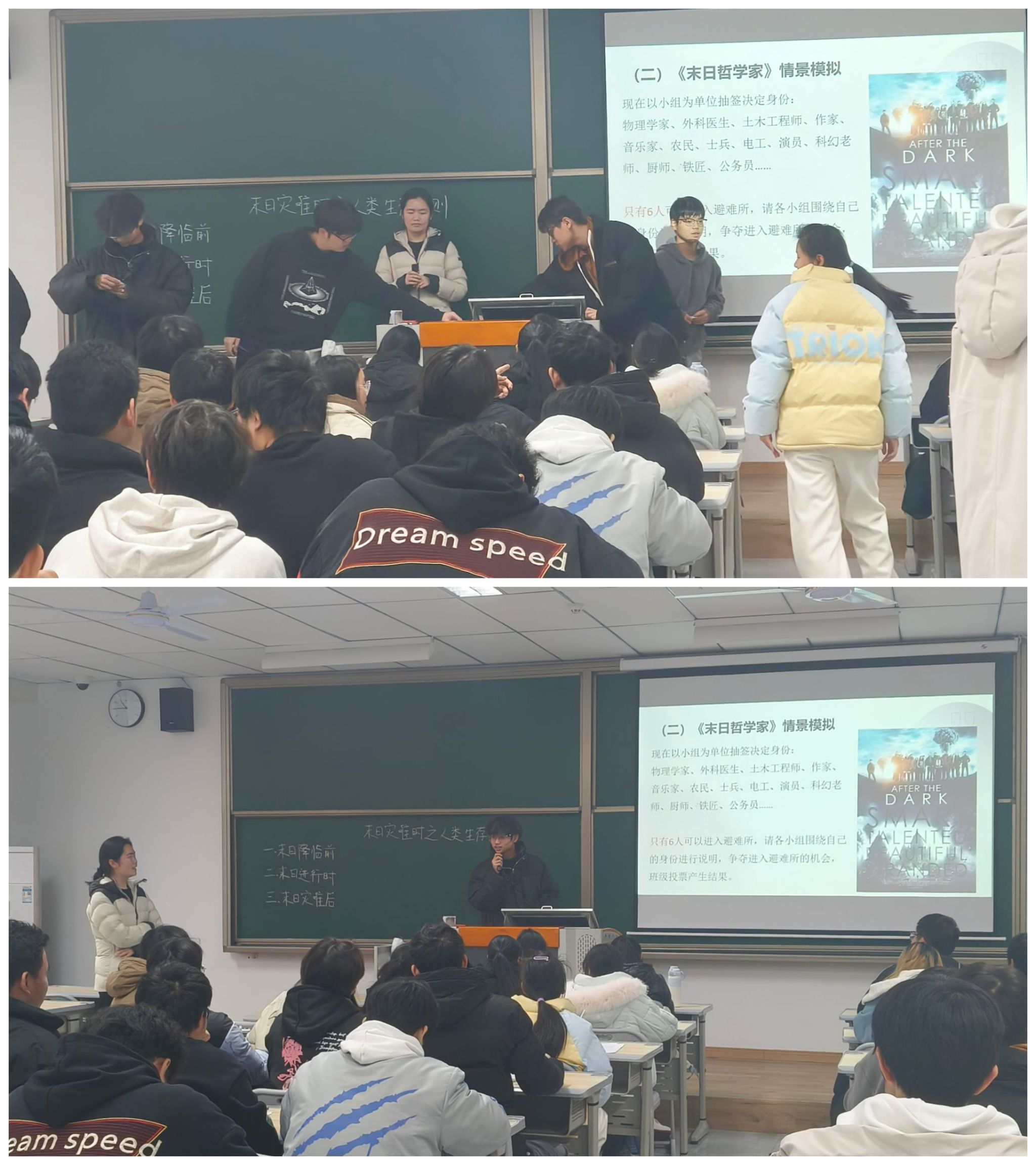 课程中期,张红老师播放《末日哲学家》思想实验片段,开启课堂情景教学。在假设的末日情景下,学生分组抽签获取身份,但仅半数能够进入避难所,学生需围绕抽签获得的身份进行争取进入避难所的演讲,最后由班级共同投票进行抉择。