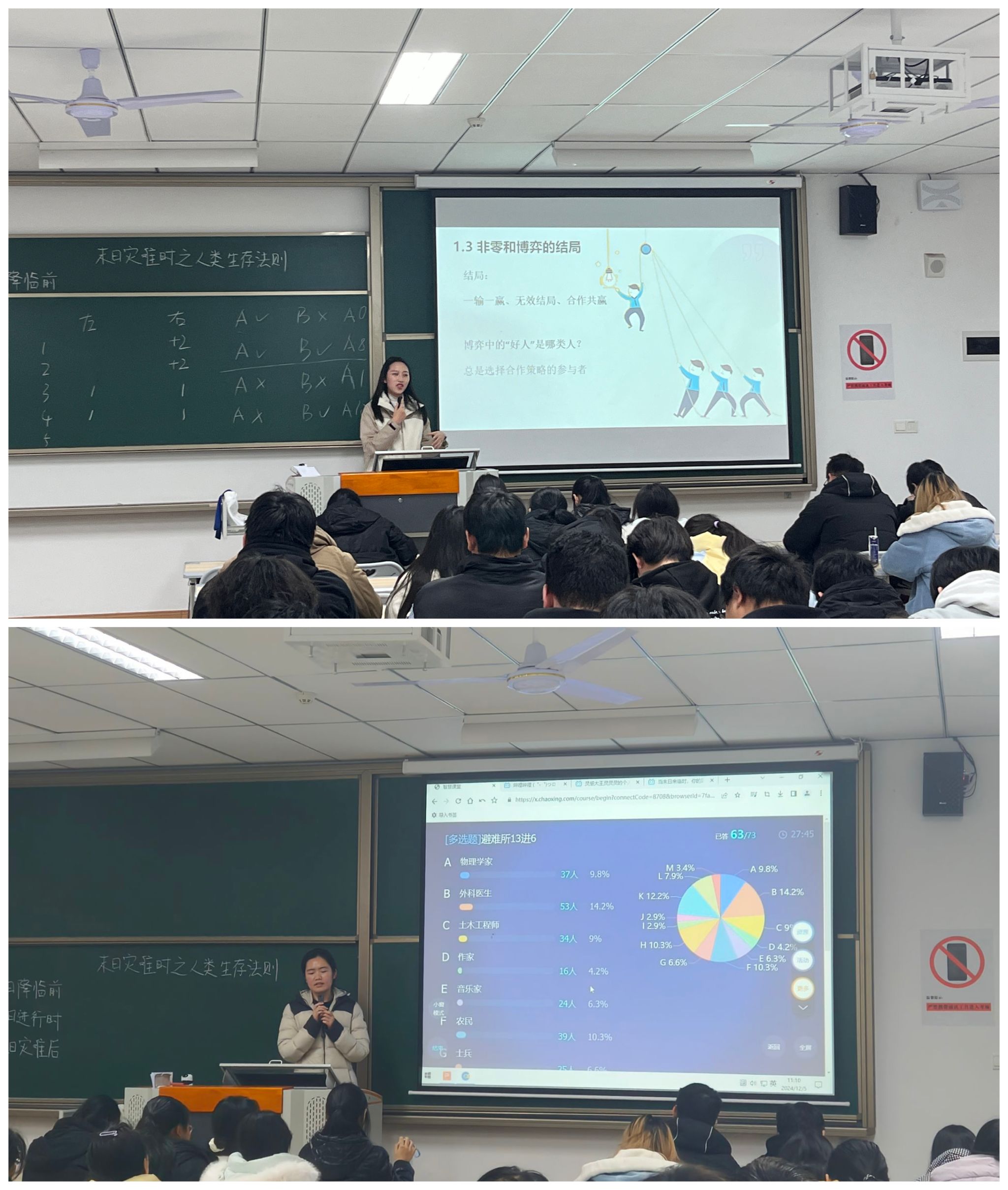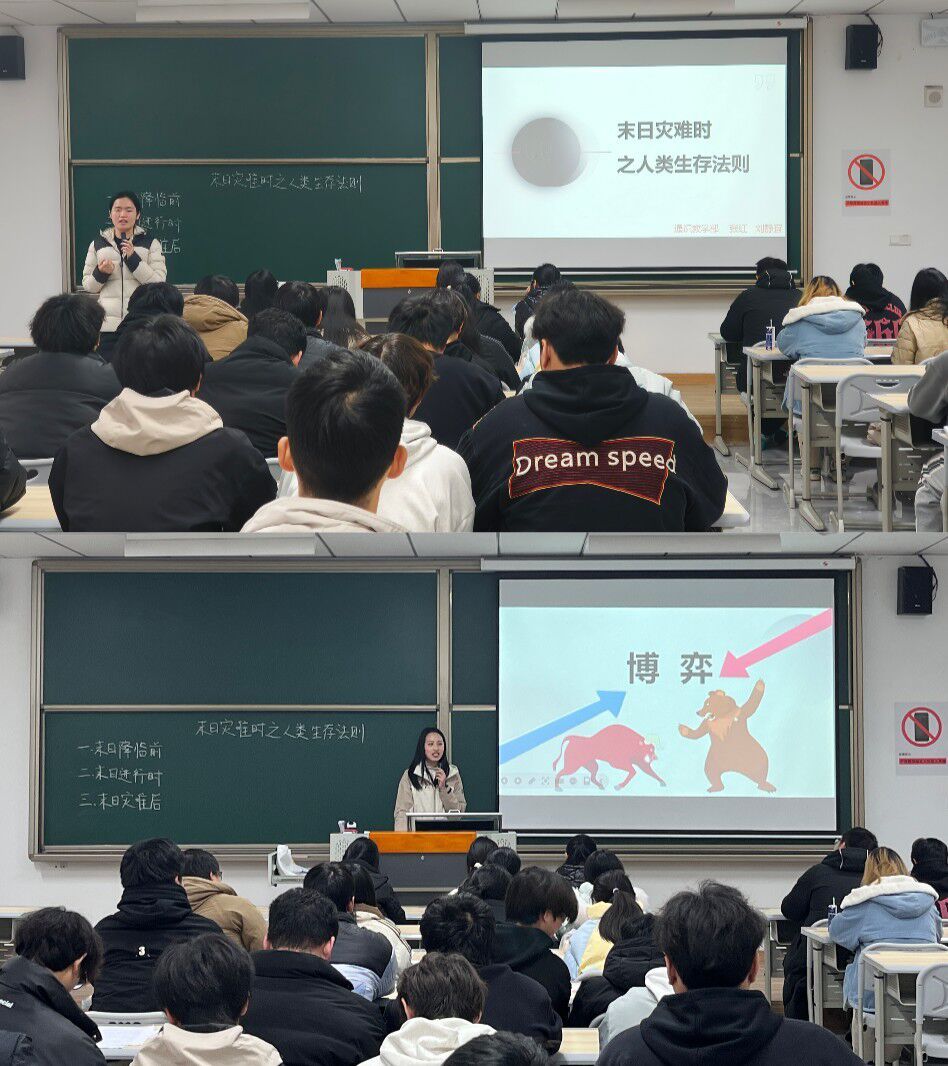 2024年12月5日,通识教学部张红老师与刘静宜老师在行者楼507教室开展了一次《科幻与想象力》课程的双师授课。本次授课以“末日之际:人性博弈与哲学反思”为主题,将末日科幻中的人性抉择与经济学中的博弈巧妙结合,带领学生从不同视角感受末日世界的残酷与较量,激发学生对现实生活中理性抉择与伦理道德的深入思考。