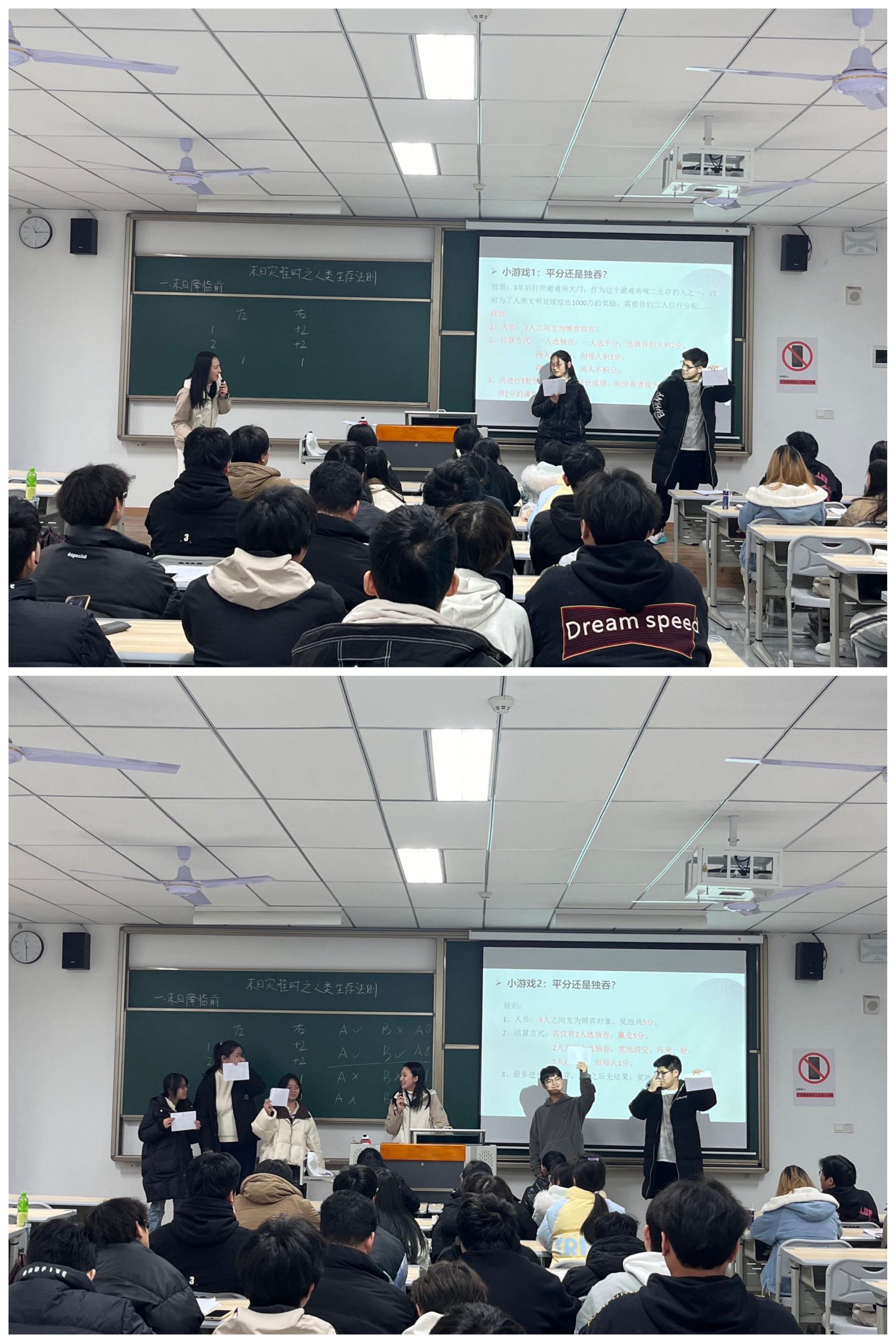 刘静宜老师结合学生在思想实验中展现的各种反抗、合作的策略,引导学生思考在末日是否也存在各种抉择,从而引出博弈话题。沿用模拟实验的场景,开展“平分还是独吞”的小游戏,邀请学生上台决策,在游戏中体验博弈,分享感悟。随后在刘静宜老师的引领下总结出博弈三要素,在对博弈有初步认知后,学生们积极分享了生活中存在的各种博弈。通过讲述经典博弈——囚徒困境,抛出疑问让所有学生参与投票选择,剖析在非零和博弈中合作与背叛的选择。
