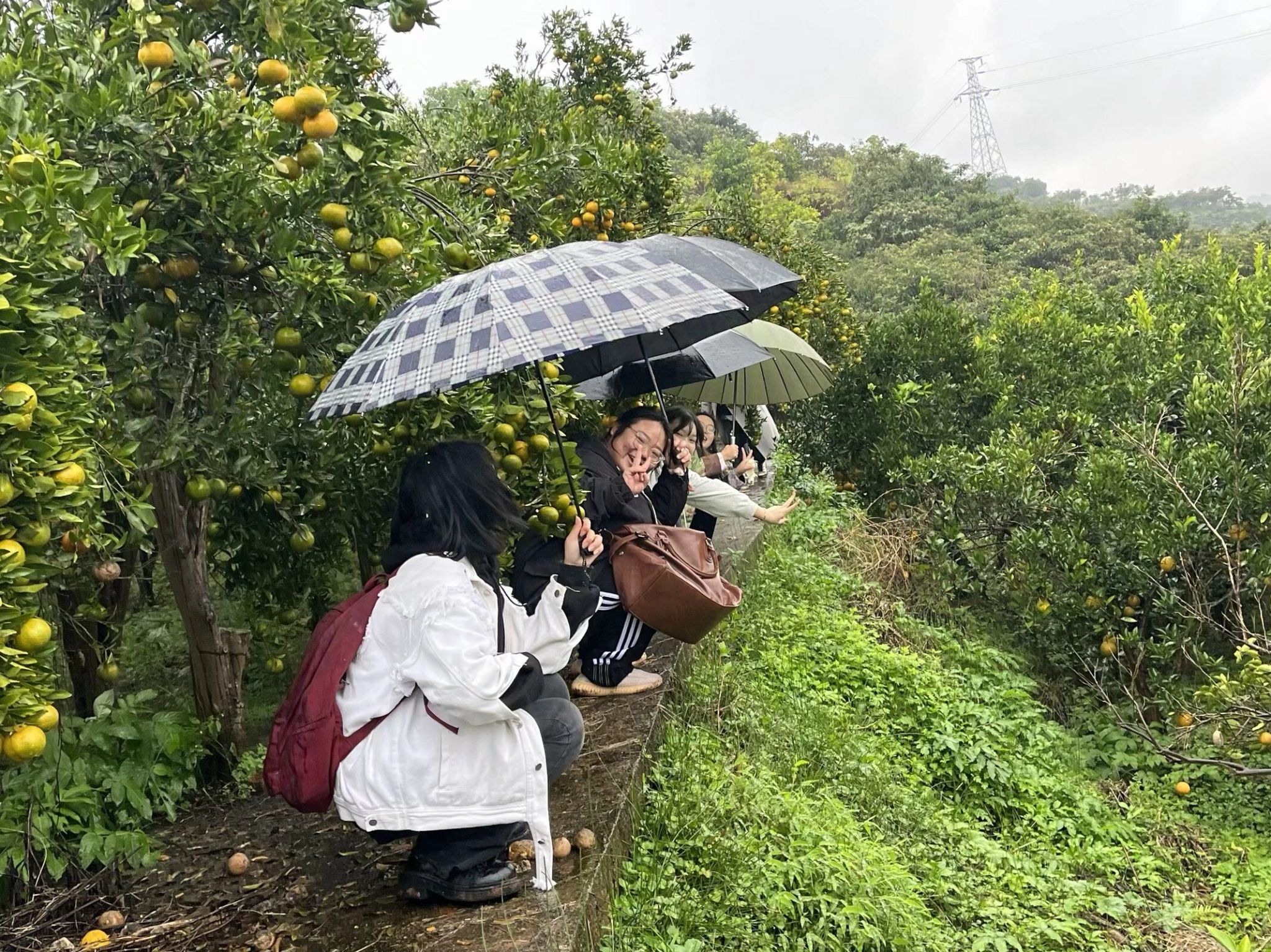 正值雨天,成员们踩着蜿蜒曲折、湿滑泥泞的山路前行,夹道便是蓄满花苞的枇杷树。净果村有数百亩的枇杷种植基地,目前已经有较为完整的以枇杷为中心的产业链,枇杷花养蜜蜂、枇杷叶售卖等附加产业也步入正轨。除了枇杷树,还有沃柑树和柚子树,漫山遍野的果树让成员们目不暇接。刘总介绍,整个山头橘子的种类有好多种,颜色、口感、成熟期上各有千秋。整个果园果木成林,欣欣向荣,颇具规模。