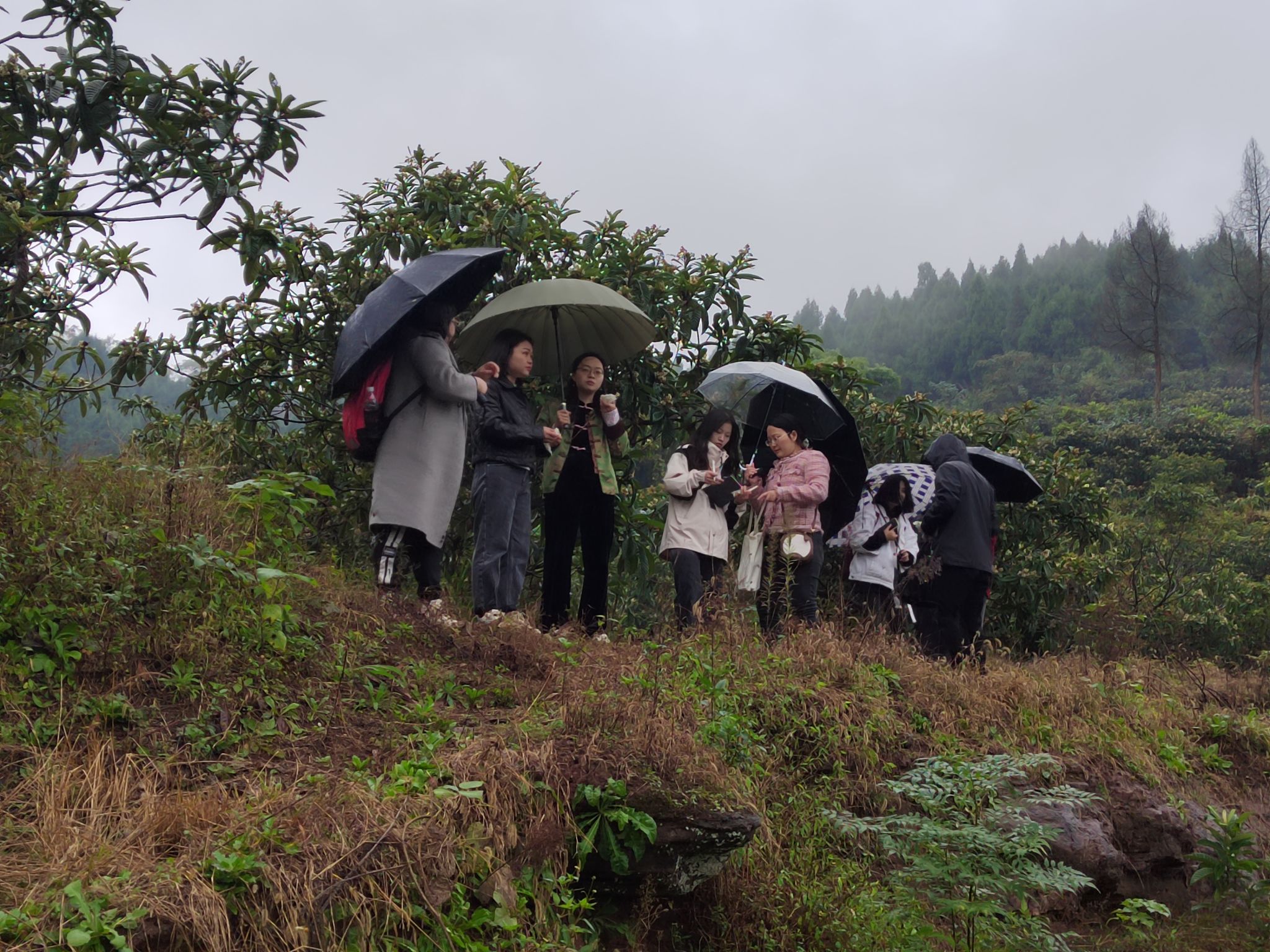 随后,成员们又徒步到了东风水库、鸡场、枇杷交易市场等地,考察净果村土地使用情况。净果村曾经开设过旅游项目,但收益不佳,活动场地便荒废了。随后,成员们到净果寺庙进行调研,这座千年的寺庙饱经风雨,但仍然保存完整,合川区政府也曾出资维护修缮,但香火仍然冷清。随后,成员们前往红枫林,此时的枫树仍然以绿色为主,几缕红色夹杂其中。生长旺盛、已具规模的红枫林是净果村宝贵的旅游资源。途中偶遇村民,与其交谈,村民淳朴热情,成员们对净果村的风土人情有了更深入的了解。