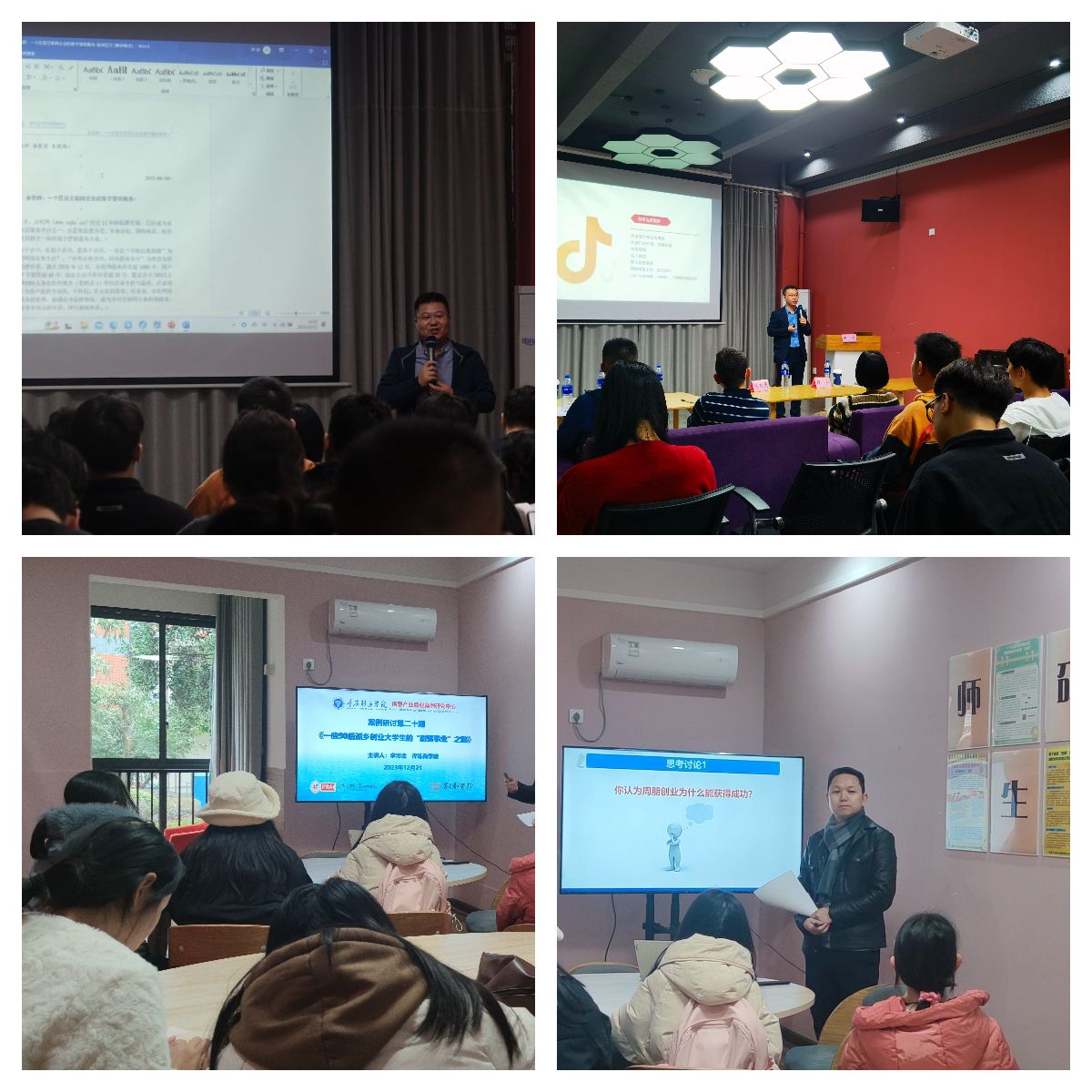 本学期举办的商业案例师生研讨活动中,第15期、第20期聚焦实战创业,为同学们带来了丰富的创业经验与创业体会。其中第15期由淬炼商学院陈郑老师以《合优网:一个区县互联网企业的数字营销服务》为研讨主题,特别邀请了重庆麦维信息技术有限公司(合优网)总经理魏杰与同学们分享了创立合优网的过程,并与同学们一起探讨了合优网未来的数字营销服务升级。第20期由淬炼商学院李邓金老师以我校优秀毕业校友周朋的真实创业案例为研讨主题,结合我校数字经济时代高情商管理者这一培养目标带领同学们一起讨论了创业过程中如何走出困境并创业成功。