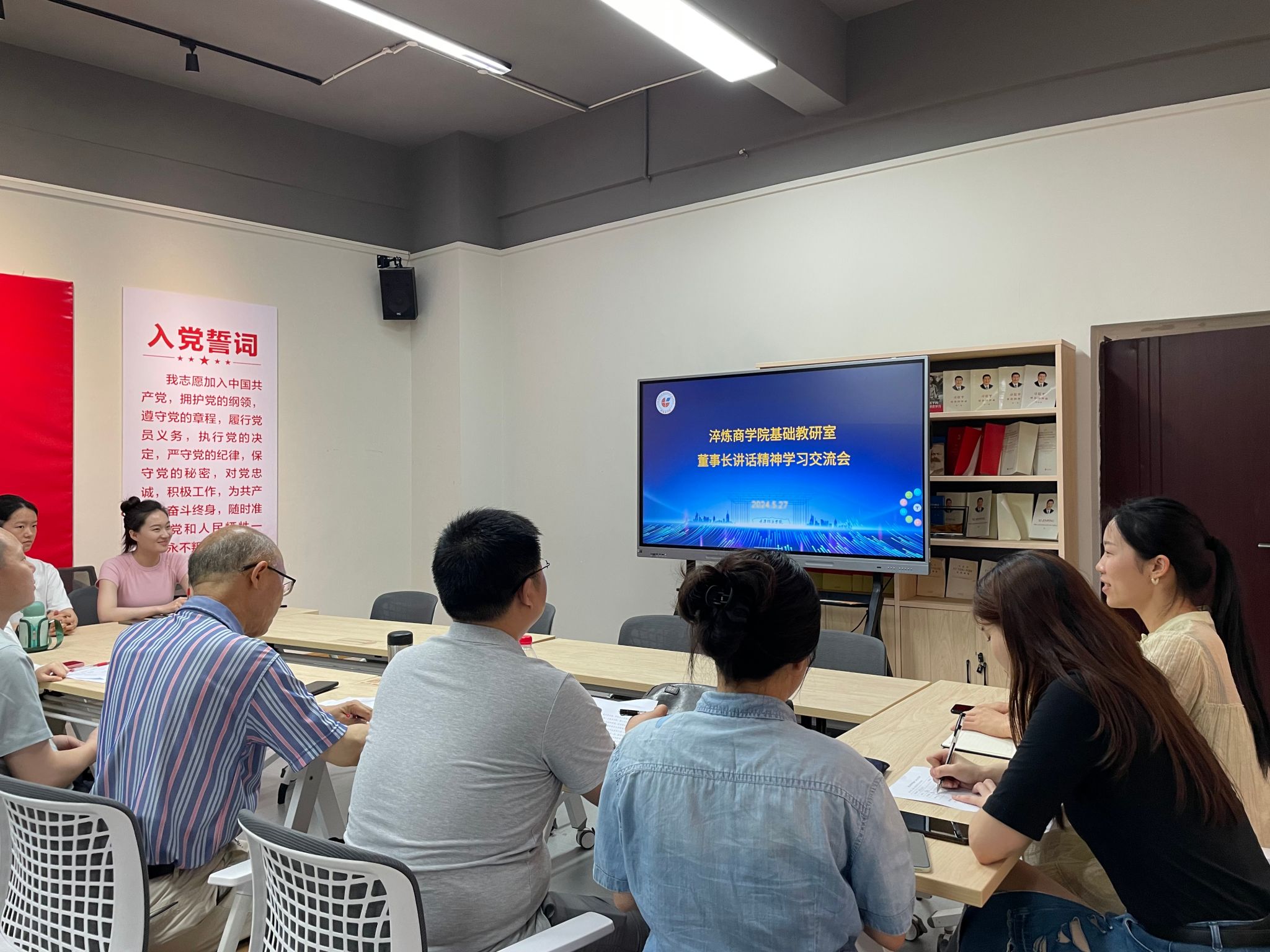 为深入领悟董事长相关讲话精神,推动淬炼商学院基础教研室教师深刻理解“四位一体双院制+特色课程”人才培养模式,深刻理解致力于未来成为“双一流之外的首选大学”的办学目标。5月27日下午16:00,董事长讲话精神学习交流会在南湖书院党员活动室108举行。本次学习活动由淬炼商学院基础教研室主任李邓金老师主讲,基础教研室全体老师参与。