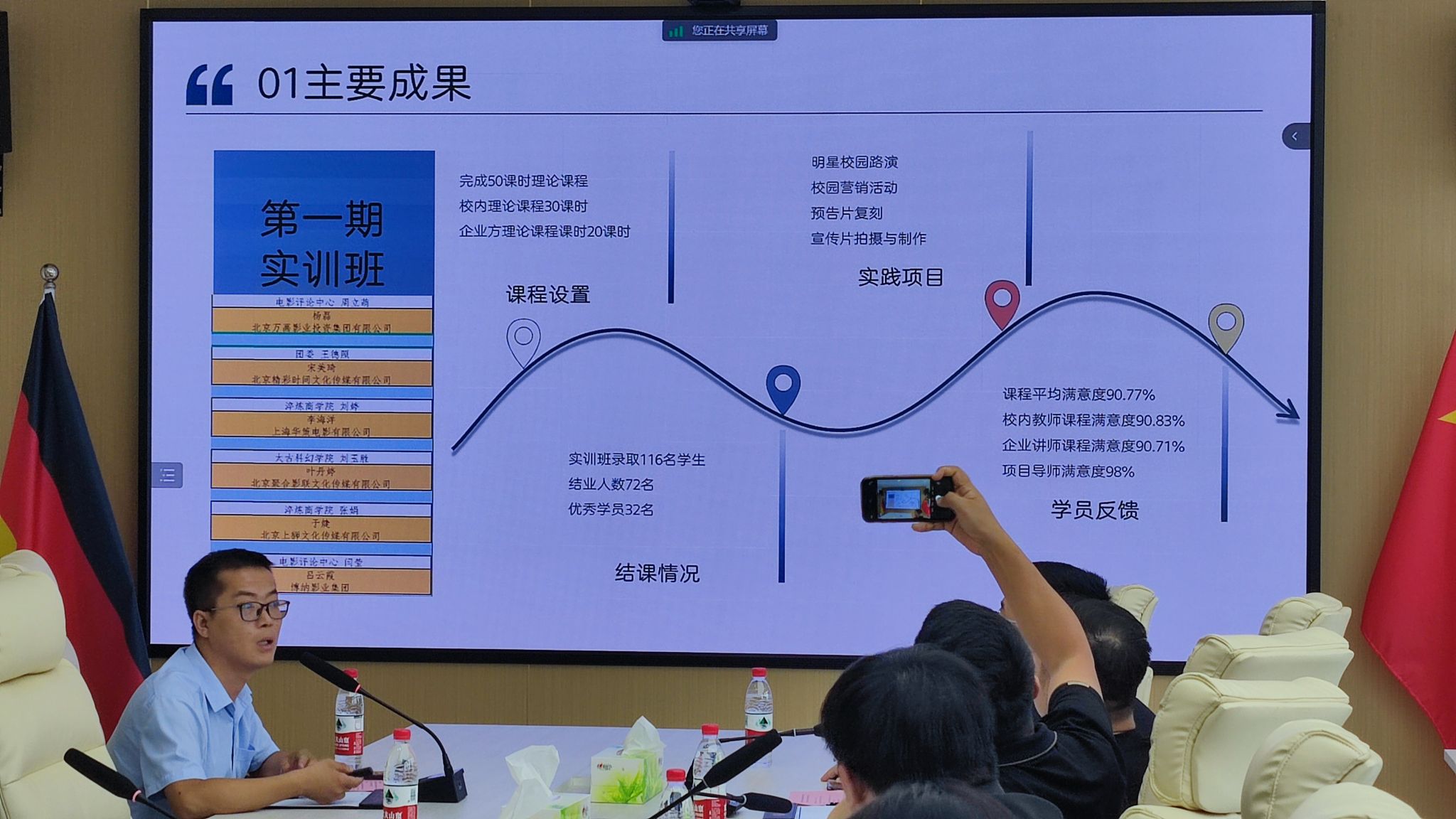 再次,泰山科技学院电影商务产业学院的贾学东老师从学院现状、阶段重点成果和学院特色发展思考对本学期工作进行了汇报。本学期开展了大咖进课堂、明星路演、北京国际电影节、预告片复制等各式各样的实践活动,在培养学生就业择业能力的同时,聚焦电影商务,助力打造山东地区特色学院品牌。