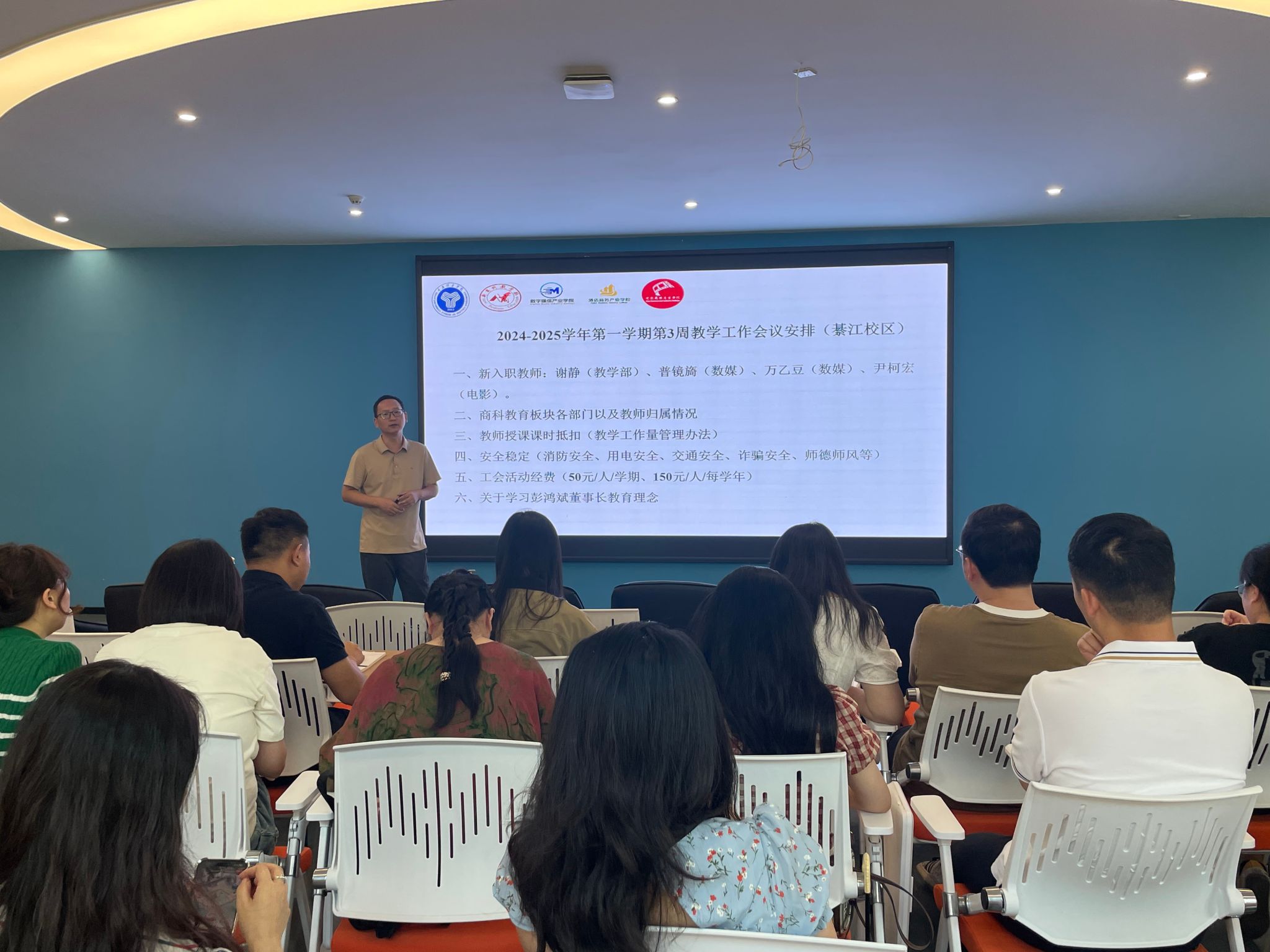 为深入学习和贯彻彭鸿斌董事长的教育理念,确保新学期的教学工作顺利开展,9月18日下午16:40,范院长在贤者楼路演大厅召开了綦江校区商科板块的教学工作会议,参会人员为綦江校区商科教育板块全体教师。