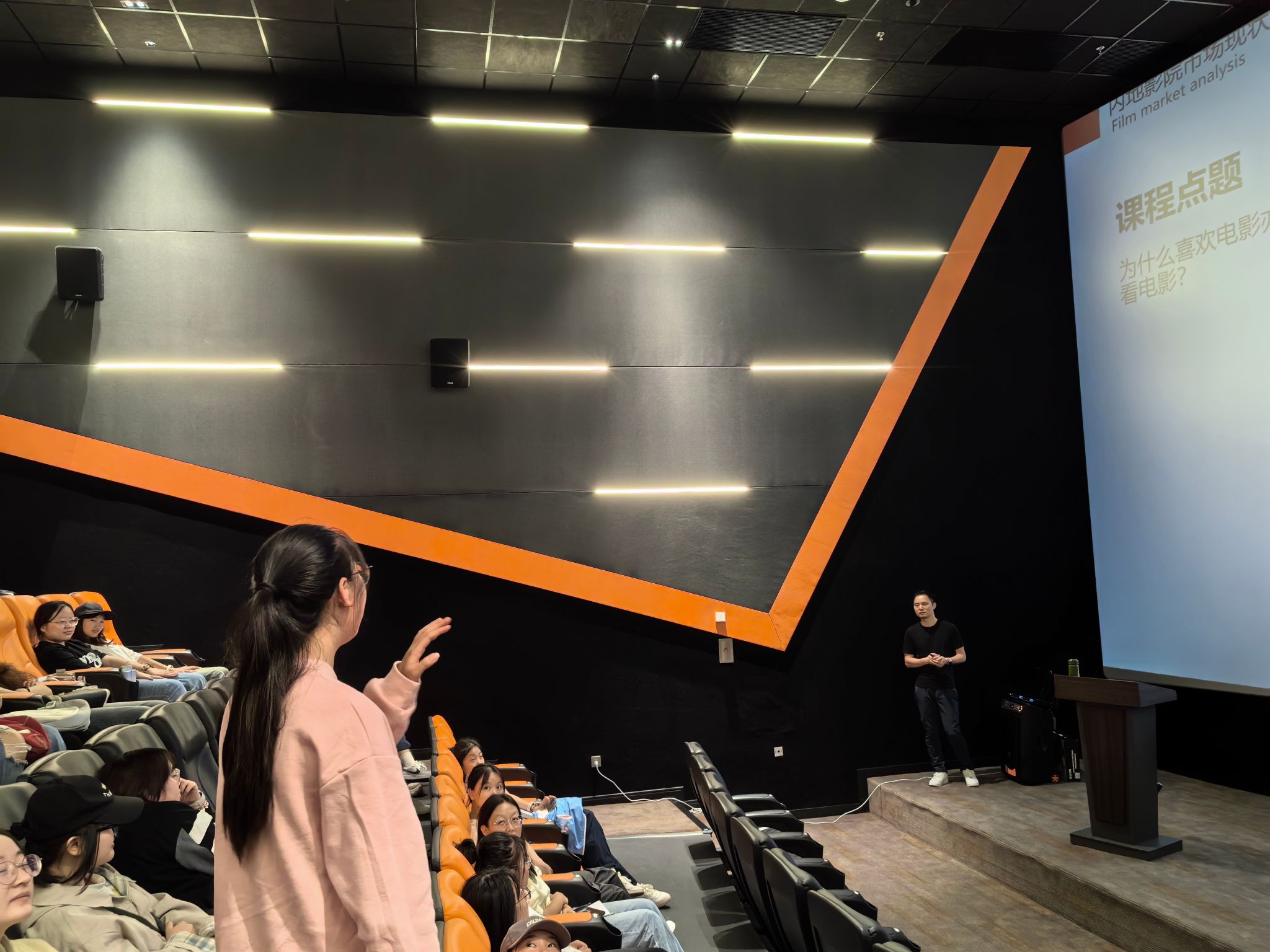 随后,杨磊副院长从影院数量、票房数据、观影人次、票价水平、上座率以及院线排名等多个方面,全面剖析了国内影院市场的现状。他通过详实的数据和生动的案例,向同学们展示了国内影院市场的发展历程和竞争格局。同时,他还就同学们关心的行业热点问题进行了深入解答和互动交流,现场气氛热烈而活跃。