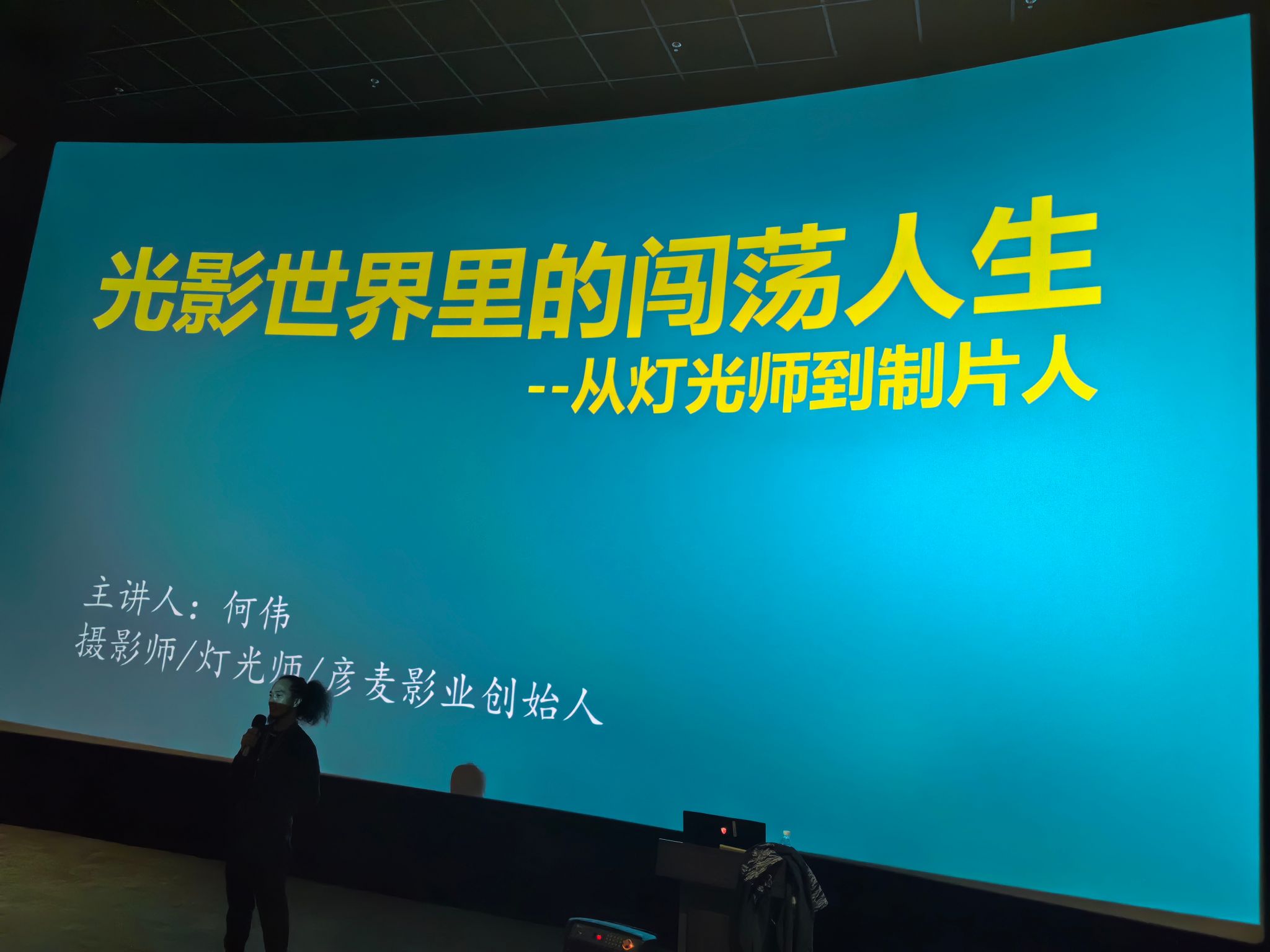 10月30日,万画影城4号厅内,一场关于光影世界的授课在此举行,本次授课的主讲人是摄影师、灯光师及重庆义伟文化传播有限公司总经理,何伟老师,他带来了题为“光影世界里的闯荡人生——从灯光师到制片人”的专题授课,为实训班的同学们带来了一节丰富的课堂。