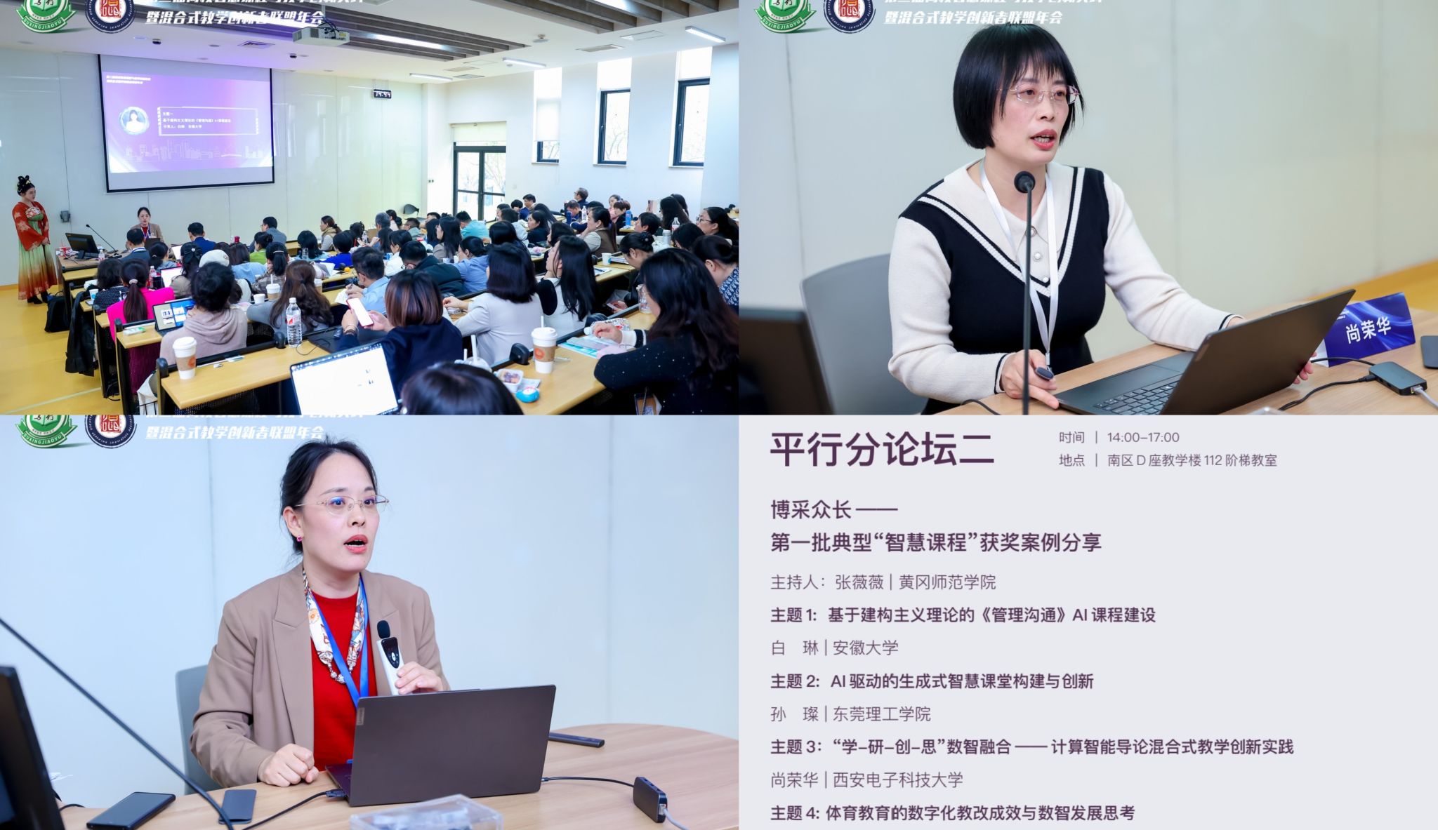 11月9日下午,年会设立了五个平行分论坛,分别围绕混合式教学设计创新案例分享、智慧课程建设案例分享、AI赋能教学主题辩论、有效混合式教学设计工作坊以及智慧教学工具箱等议题展开深入研讨。李海燕,陈明茗两位教师参加了“分论坛二:混合式教学设计创新案例分享”,安徽大学白琳教授、东莞理工学院孙璨教授、西安电子科技大学尚荣华教授、北京体育大学王宏教授等专家则展示了他们在智慧课程建设方面的探索成果。这些智慧课程建设案例,为我校提供了宝贵的实践经验。