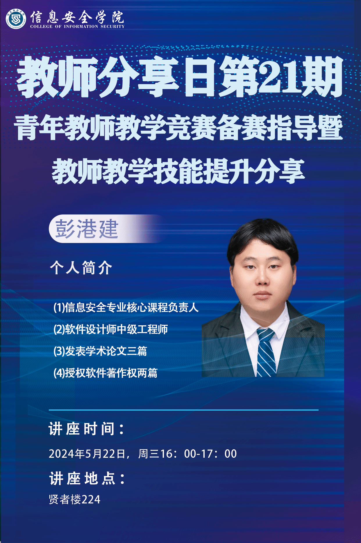 培训分享、交流研讨、经验共享,既是播种的过程,也是沉淀收获的过程。为了让团队成员能够相互取长补短,促进思维融合,弥补自己知识盲区,增加兴趣点,扩大受益面,使团队成员人人会分享懂分享乐分享,信息安全学院特推出“教师分享日”系列教研活动。第21期分享日于2024年5月22日下午4点在贤者楼224开展,主题为“青年教师教学竞赛备赛指导暨教师教学技能提升分享”,由彭港建老师主讲,分享会介绍了第七届青教赛的赛制规则,详细阐述了比赛的理念以及对于工科课程备课的感悟,助力青年教师提升教学技能。本次分享活动由信息安全教研室主任周小艳主持,信息安全教研室全体教师以及学院感兴趣的专任教师参加。