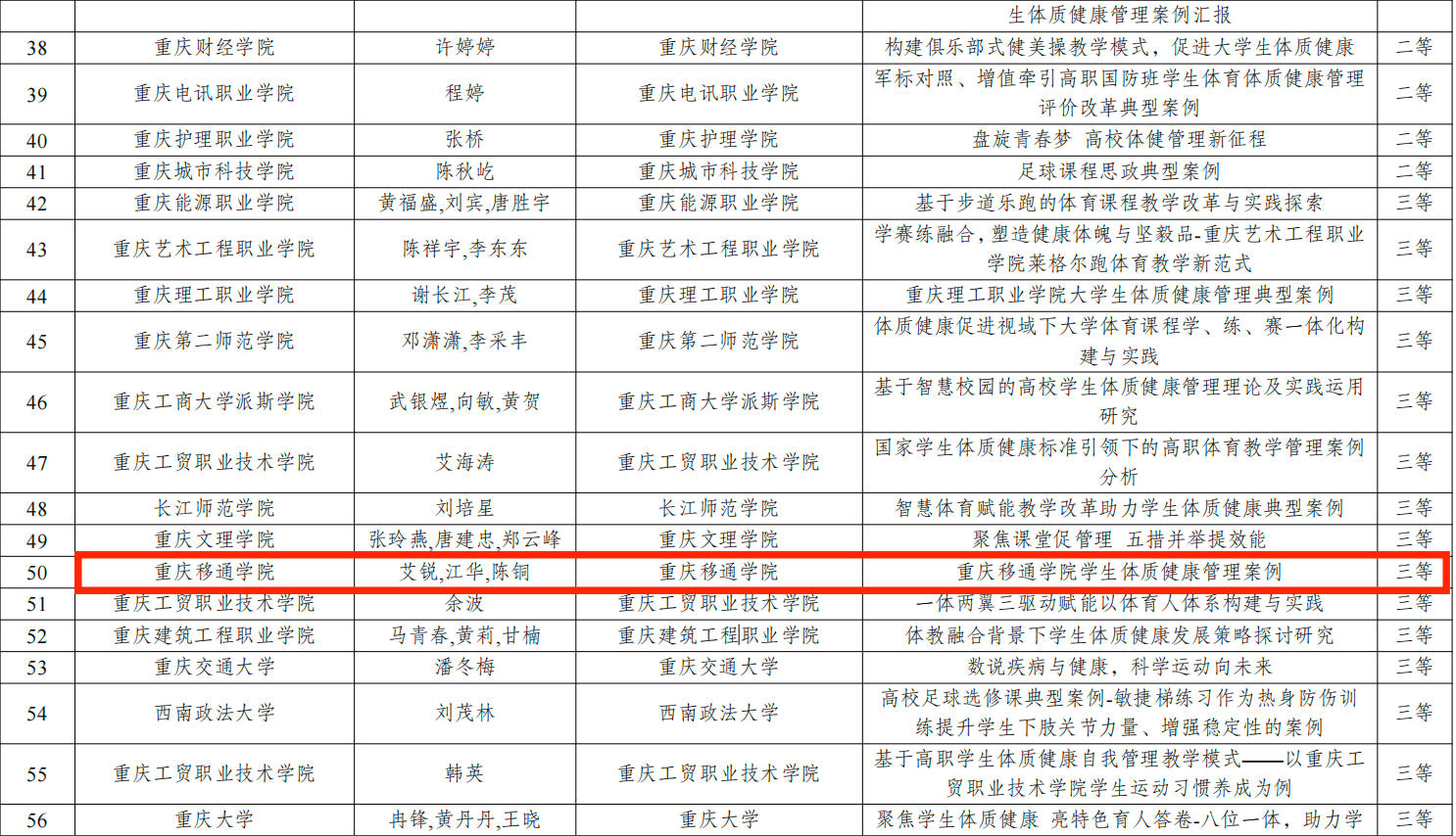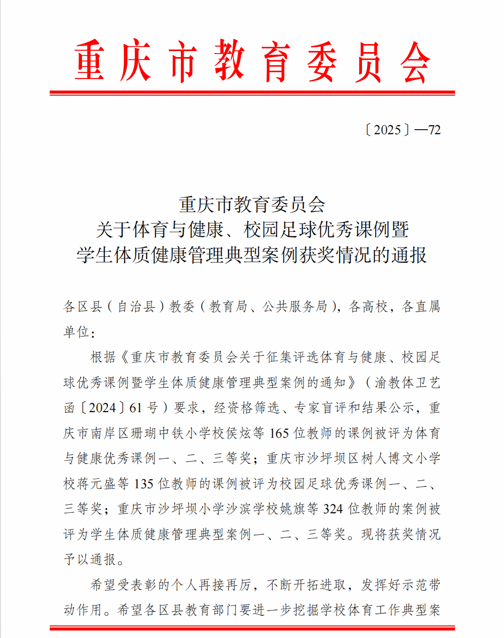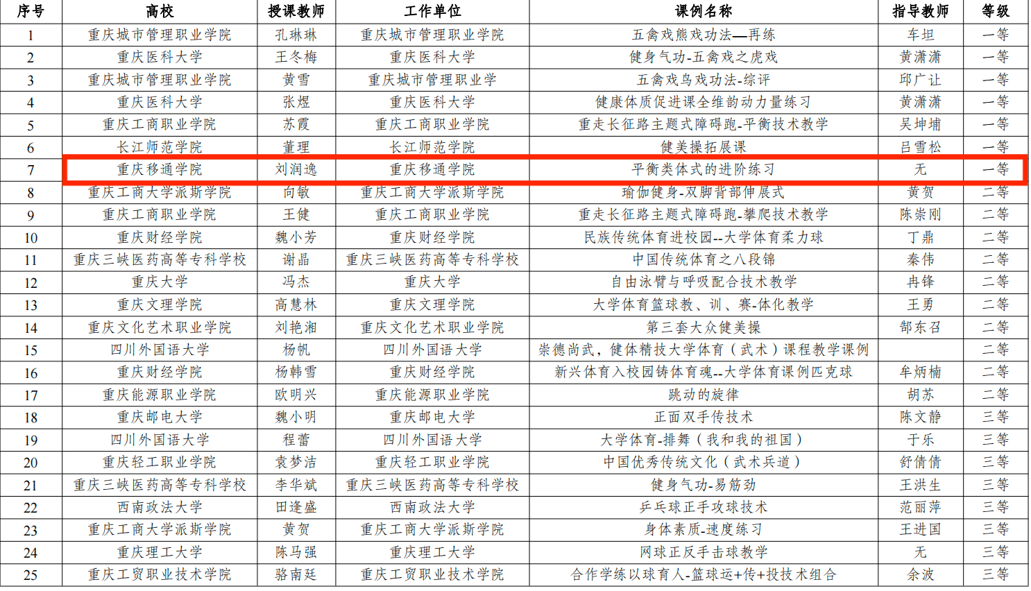 近日,由重庆市教育委员会公布了“体育与健康、校园足球优秀课例暨学生体质健康管理典型案例”获奖名单。经资格筛选、专家盲评和结果公示,我校获一等奖1项、三等奖1项。其中,竞技体育中心刘润逸老师主讲的瑜伽专项课程——《平衡体式的进阶练习》课程以创新教学模式、深化体教融合为特色,成为学院推进体育课程改革的标杆性成果。