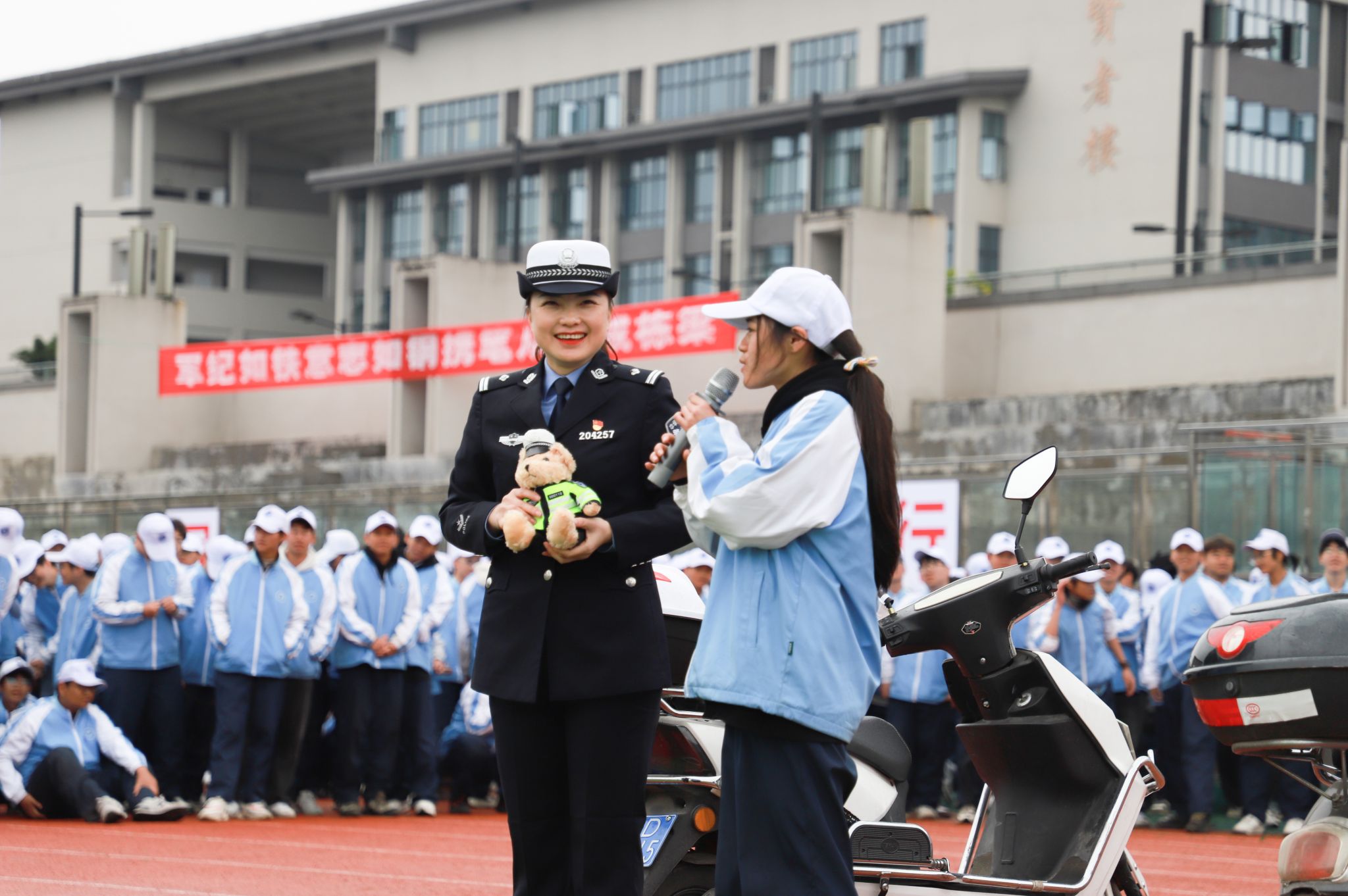 在交通安全宣教环节,綦江区公安局交巡警支队曹颖警官创新引入实物教学法。现场展示三种电瓶车,结合真实事故案例,深入讲解交通法规要点。通过头盔防护演示等实景教学,让“一盔一带”安全理念深入人心。同学们纷纷表示,这种“看得见,摸得着”的普法方式,让法规条文变得鲜活易懂。