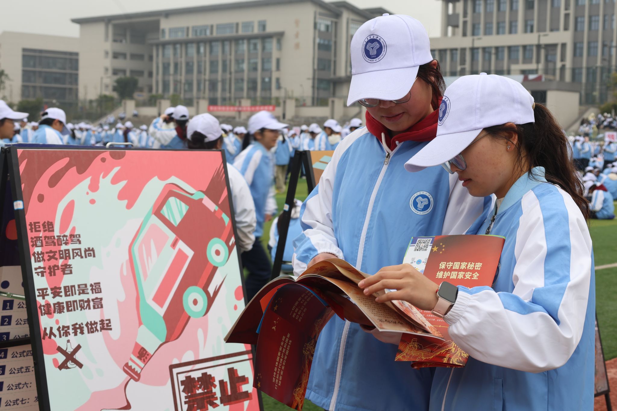 活动现场同步设置法制宣传展台,工作人员通过普法宣传资料发放、设置法制宣传展板等立体化形式,吸引大批学生学习和了解法制知识,图文并茂的呈现方式使晦涩法条变得触手可及,实现法治教育从“单向灌输”到“双向互动”的转变。