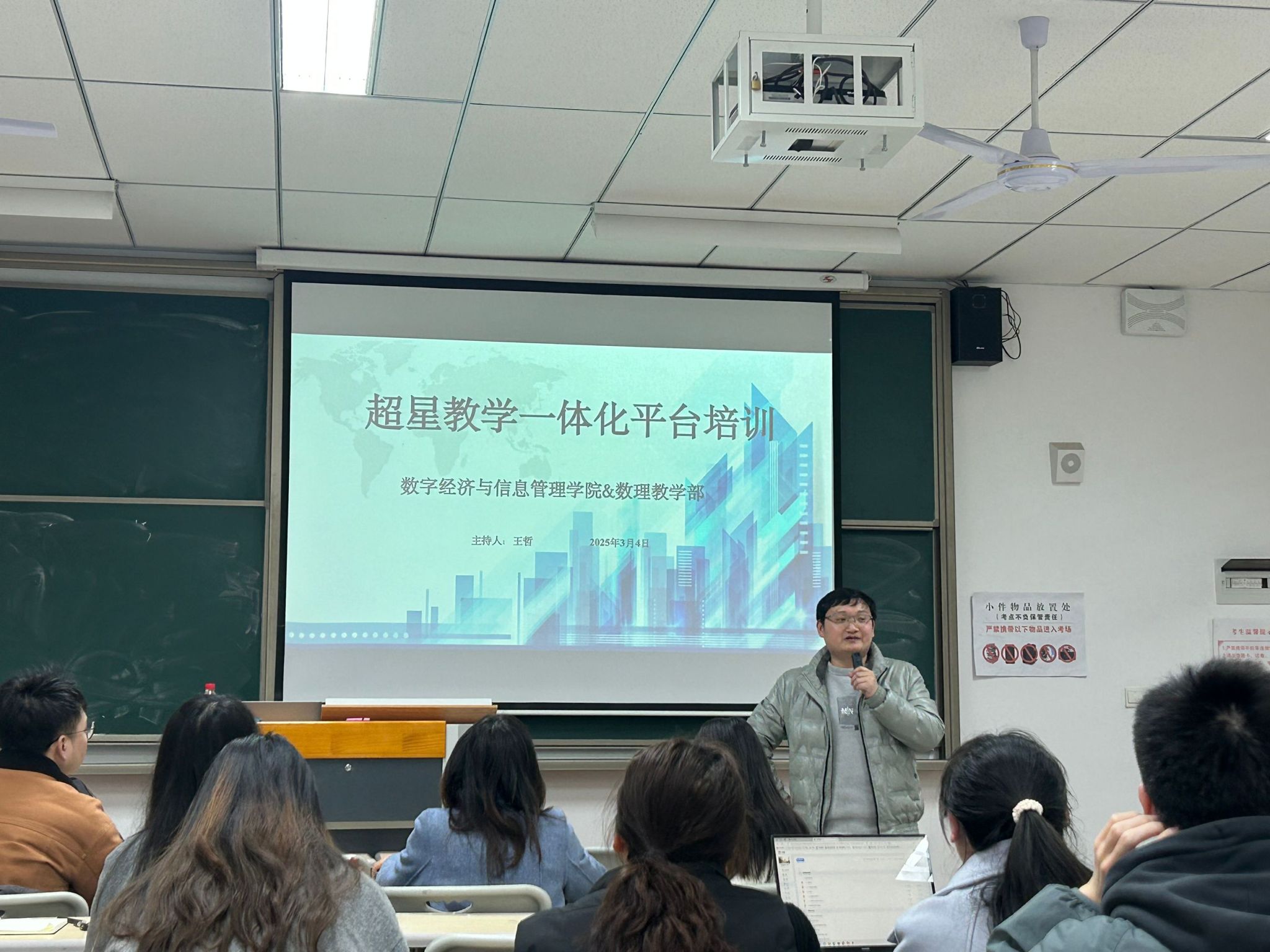 为深化教育教学数字化转型,推动线上线下混合式教学模式创新,2025年3月4日数字经济与信息管理学院联合数理教学部在仁者楼401举办超星教学一体化平台专题培训。此次培训由数字经济与信息管理学院教学副院长王哲主持,邀请了超星集团专业讲师吴明巧对平台各项教学功能展开系统的讲解与实践应用,让教师深度体验智慧教学新生态。