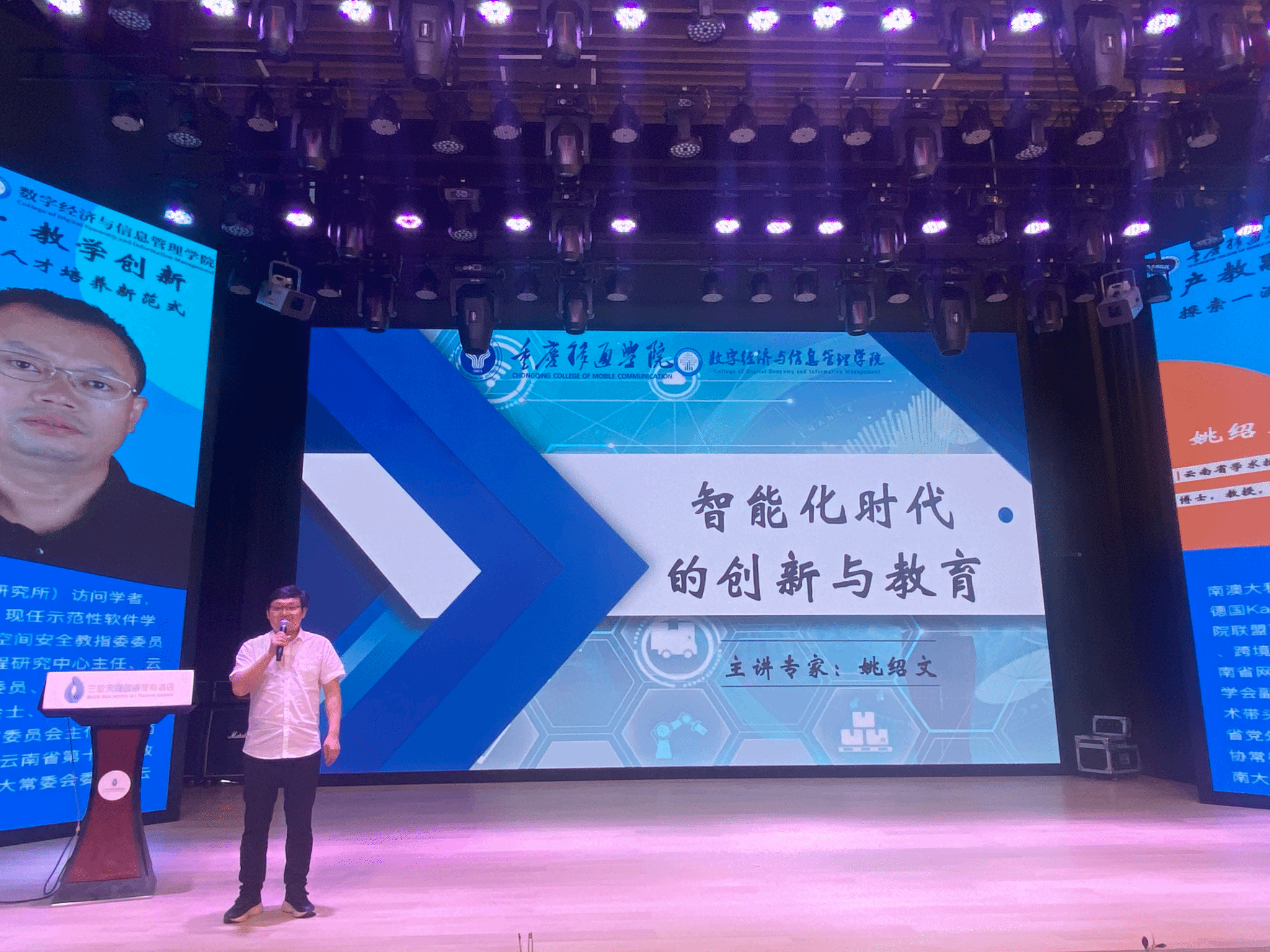 随后,姚教授以“智能化时代的创新与教育”为开篇,深入剖析当下智能化浪潮给教育带来的变革与挑战,为教师们打开了洞察前沿教育趋势的新窗口。讲座内容深入浅出,从案例入手,通过物联网、云计算、AIGC、工业4.0等新名词新概念阐述互联网和人工智能在当代社会中的重要作用,强调数字化转型的必要性。他提到,“XX+”、作为一种新的发展模式,各种领域的“互联网+”形成平台化垄断,正在引领各行各业的变革。并且,通过多个生动的案例分析,深入剖析了互联网和AI如何推动产业升级和转型,并对未来的发展趋势进行了预测,为老师们描绘了一幅智能化时代的教育创新蓝图。