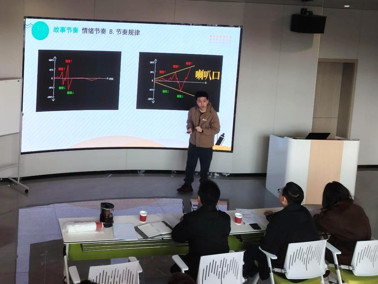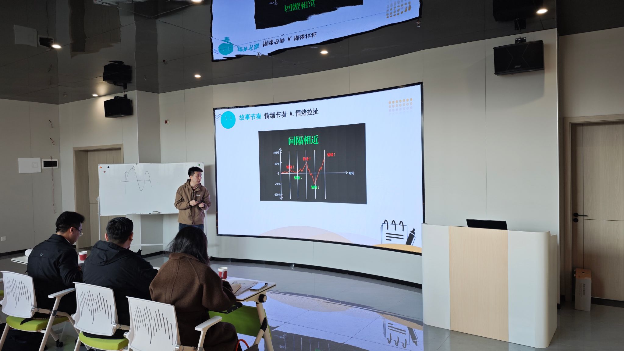 田宗霖老师以《创意写作》的“故事节奏”为赛课章节,他幽默风趣,通过邀请现场听众绘制情绪节奏曲线,并将游戏与恋爱约会故事联动,结合游戏进阶机制,配以故事的情绪节奏、情节节奏,生动解析故事节奏的层次递进,课堂互动热烈,笑声不断。