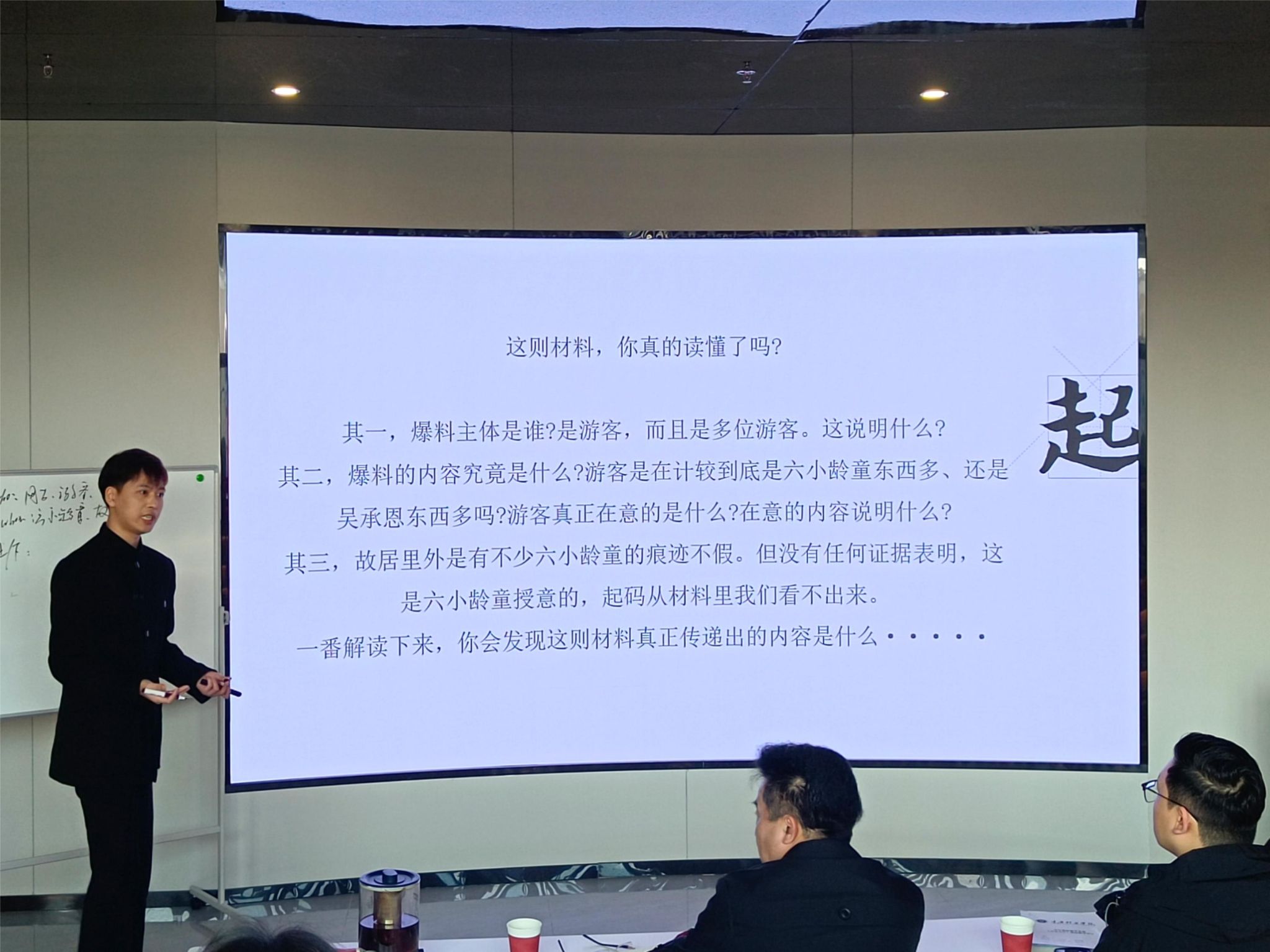 周彬老师在《修辞与伦理》之 “文案写作的四大能力” 课堂上,巧妙地以 “六小龄童占据吴承恩纪念馆,喧宾夺主?” 等多个现实新闻事件为案例,拉近了理论知识与生活实际的距离。他结合 5W1H 传播要素,抽丝剥茧般地讲解文案写作的提炼、准确、广度和逻辑能力。着重强调了捕捉核心信息与构建清晰逻辑的重要性,这种以实例为依托的教学方式,使复杂的知识变得通俗易懂,让学生们能够轻松理解并掌握文案写作的要点。