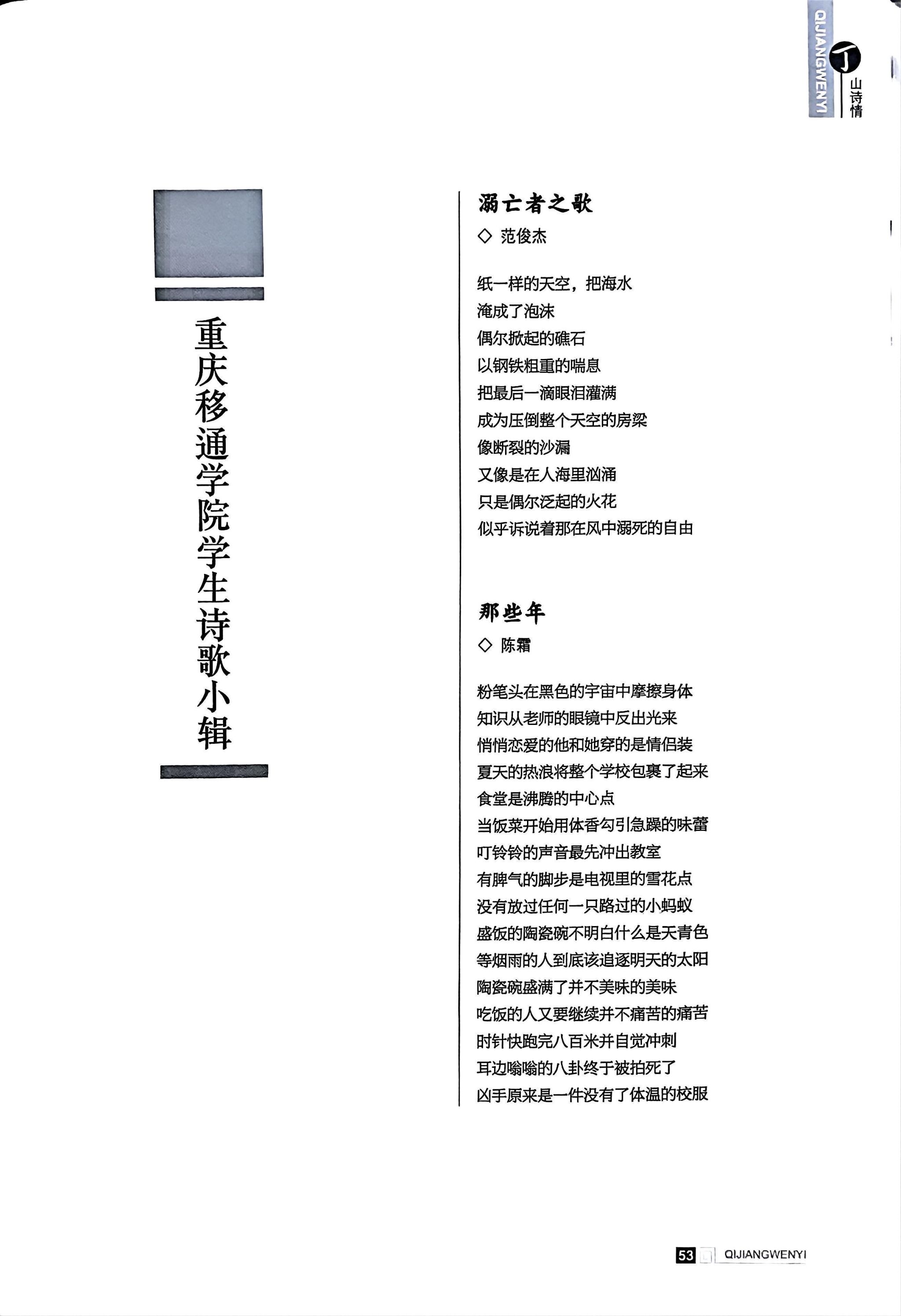 《綦江文艺》上发表了我的原创诗歌《那些年》,我很激动!在此,我由衷感谢学校创办作家班的英明决策!感谢我的诗歌启蒙黄明洋老师。他的谆谆教导让我受益匪浅。在作家班学习的一年中,我积攒了阅读量,学习了诗歌写作技巧,这些都是我诗歌创作不可或缺的基石。感谢《綦江文艺》的宝贵平台,诗歌作品的发表是对我诗歌创作水平的认可,给予了我继续诗歌创作的信心。