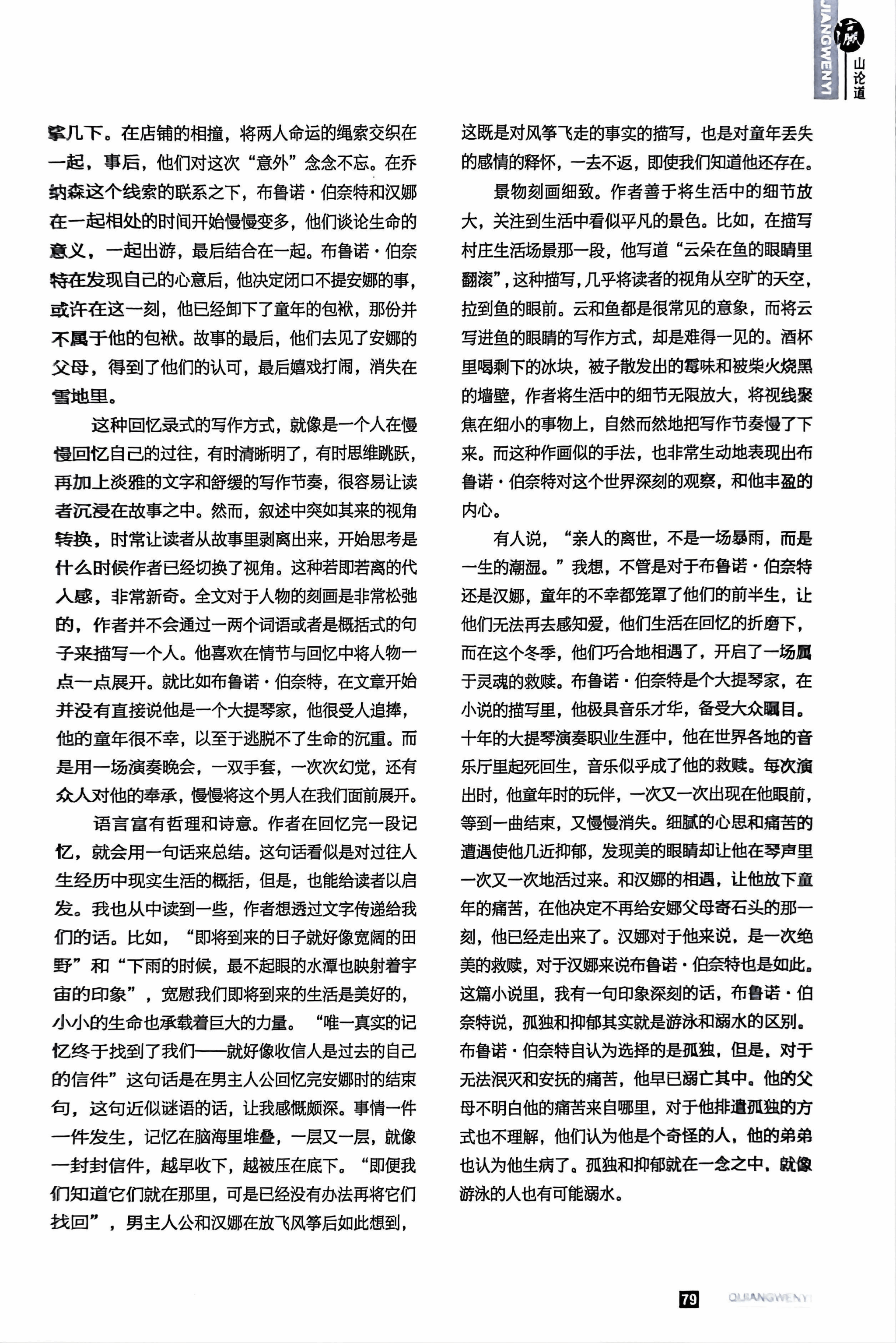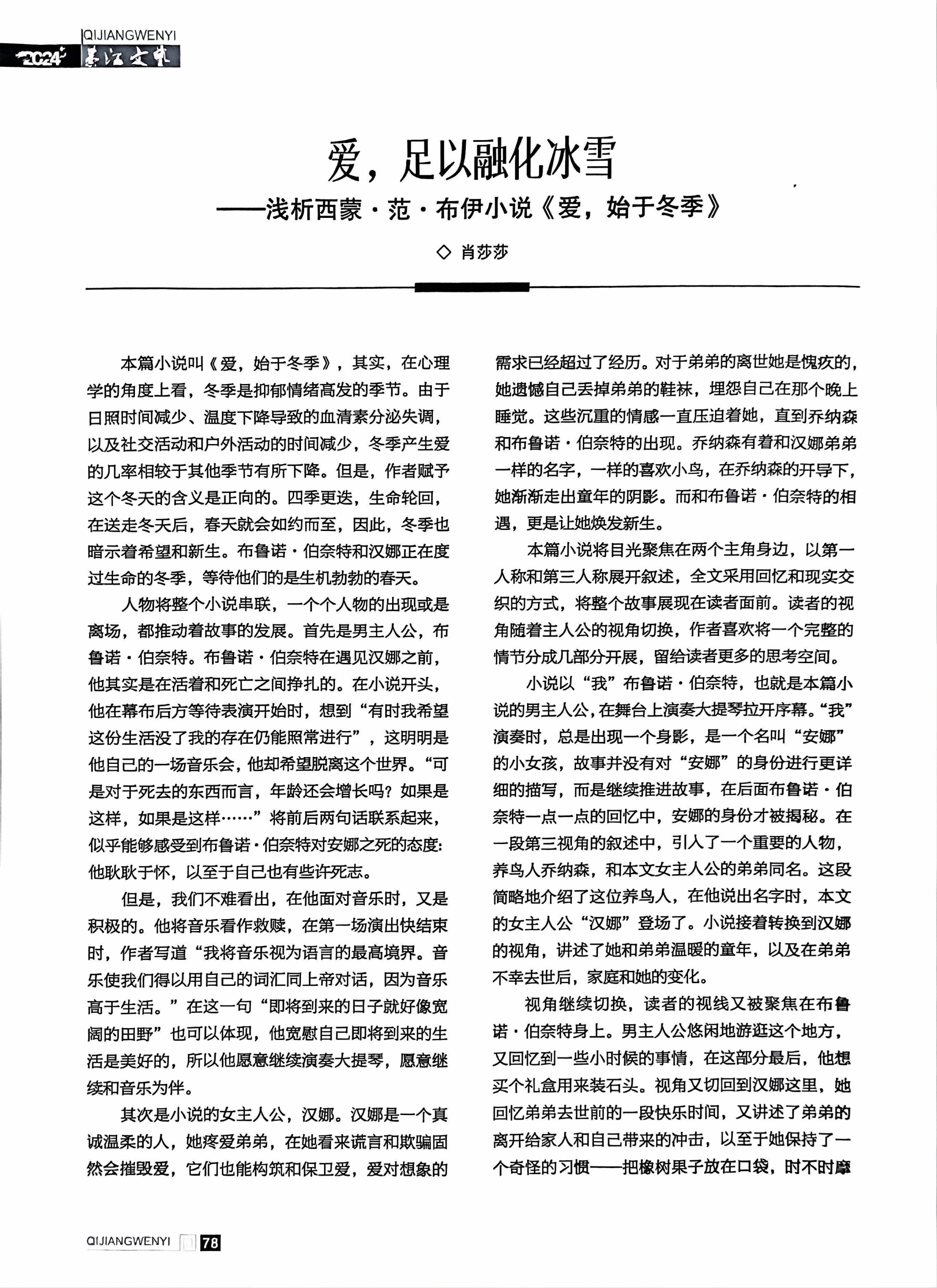 首先要感谢黄明洋老师和徐瑞皓老师的指导,感谢作家班这个大舞台,也非常感谢《綦江文艺》的赏识,让一个普普通通的我,也拥有了发表作品的机会。《爱,足以融化冰雪》这篇文章是我第一次尝试文学评论,其中并没有太多技巧性和专业性的内容,仅是我作为一个年轻的读者,浅薄的读后感分享。从反复重读原著时的困惑,到最终落笔时的豁然开朗,这次经历让我切实地和作品共情。这篇不成熟的文章只是一个起点,我将带着这份初心,继续在文学的道路上踏实前行。