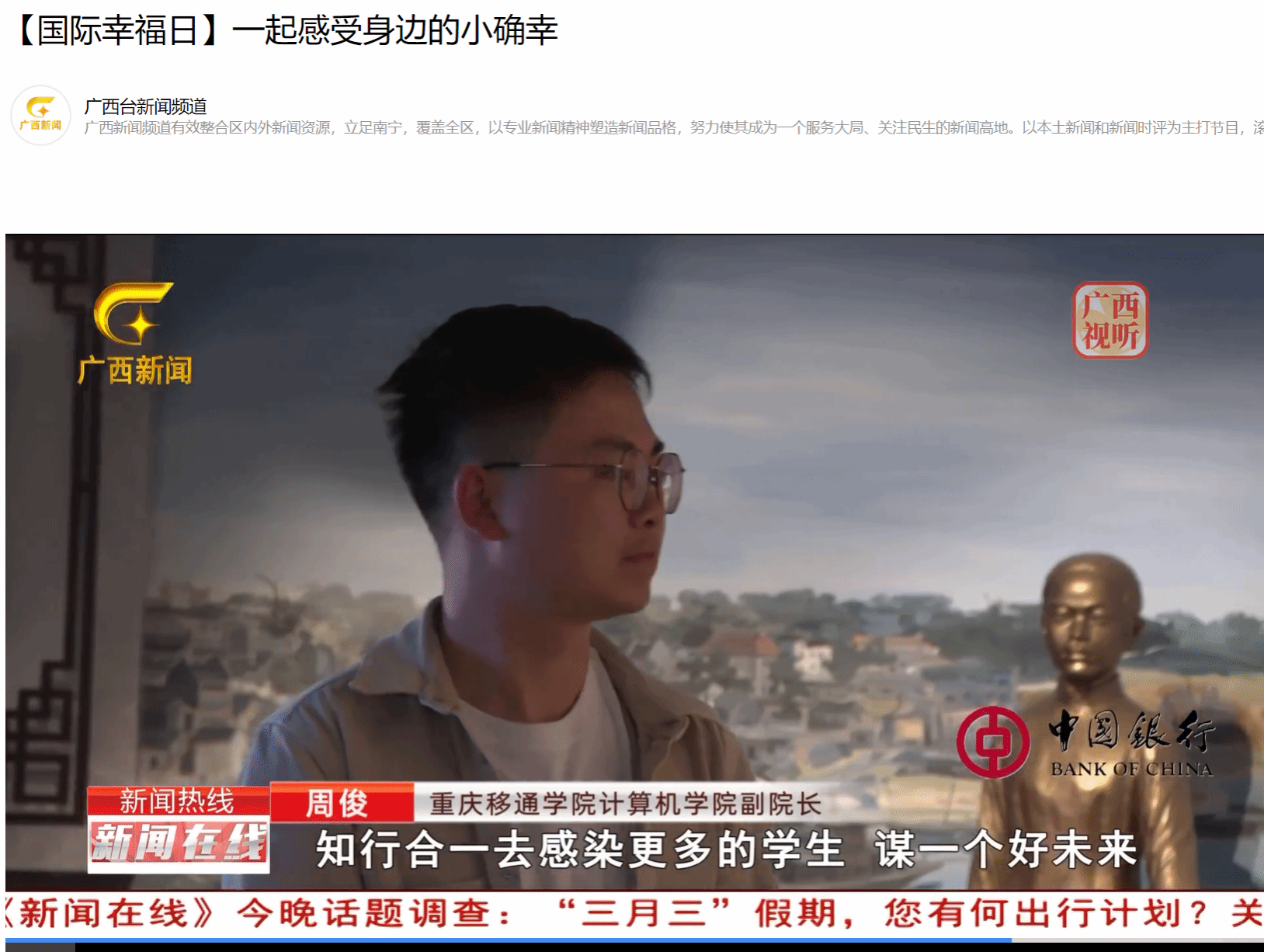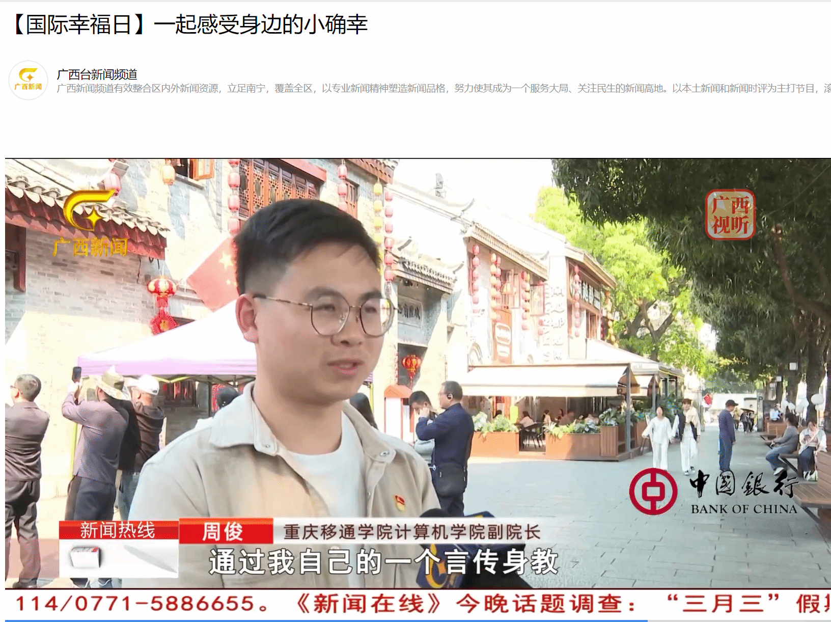 时值第十三个世界幸福日之际,计算机学院副院长周俊在纪念馆门前接受了广西广播电视台的采访,以"解码教育者的幸福方程式"为题分享育人实践。他动情表示:“教师的幸福在于点亮学生的人生——曾有多名学生对就业感到迷茫,我主动对接企业为学生创造通道,看到学生豁然开朗和状态的改变,便是党员教师践行育人使命的幸福时刻。我很感激这个社会,也希望通过自己党员老师的言传身教、知行合一去感染更多的学生,谋一个好未来!”