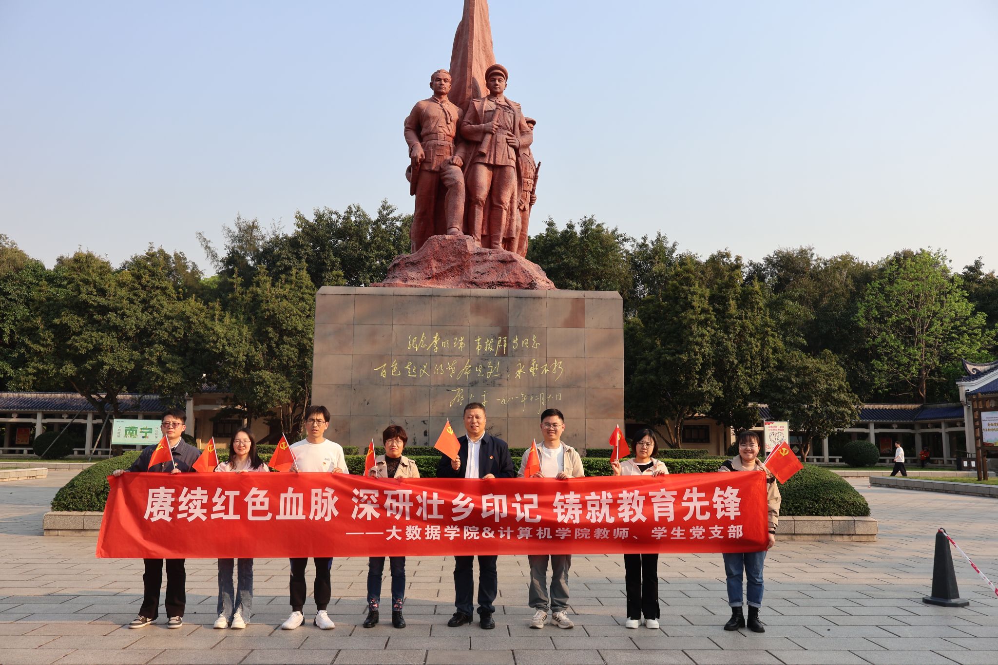 为深入学习贯彻习近平新时代中国特色社会主义思想和党的二十大精神,推动党建与学科建设深度融合,3 月 20 日至 21 日,计算机学院与大数据学院组织教师、学生党支部教师党员赴南宁开展 "赓续红色血脉 深研壮乡印记 铸就教育先锋" 主题党建调研及红色教育活动。此次活动通过“理论学习 + 实地研学 + 专业研讨”三位一体模式,构建具有学科特色的党建育人体系。