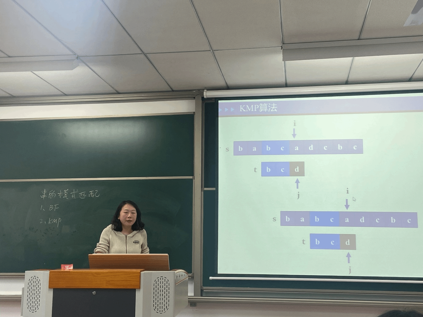 易晓银老师则以《模式匹配算法:从BF到KMP的进阶之路》为切入点,通过动态图示与代码逐行解析,生动阐释了BF算法的朴素逻辑与KMP算法的优化精髓。“算法教学需‘先慢后快’,让学生理解思想而非死记流程。”她以学生常见的理解误区为例,设计分层练习任务,并分享如何通过“问题链”引导学生在对比中掌握算法设计的核心逻辑。