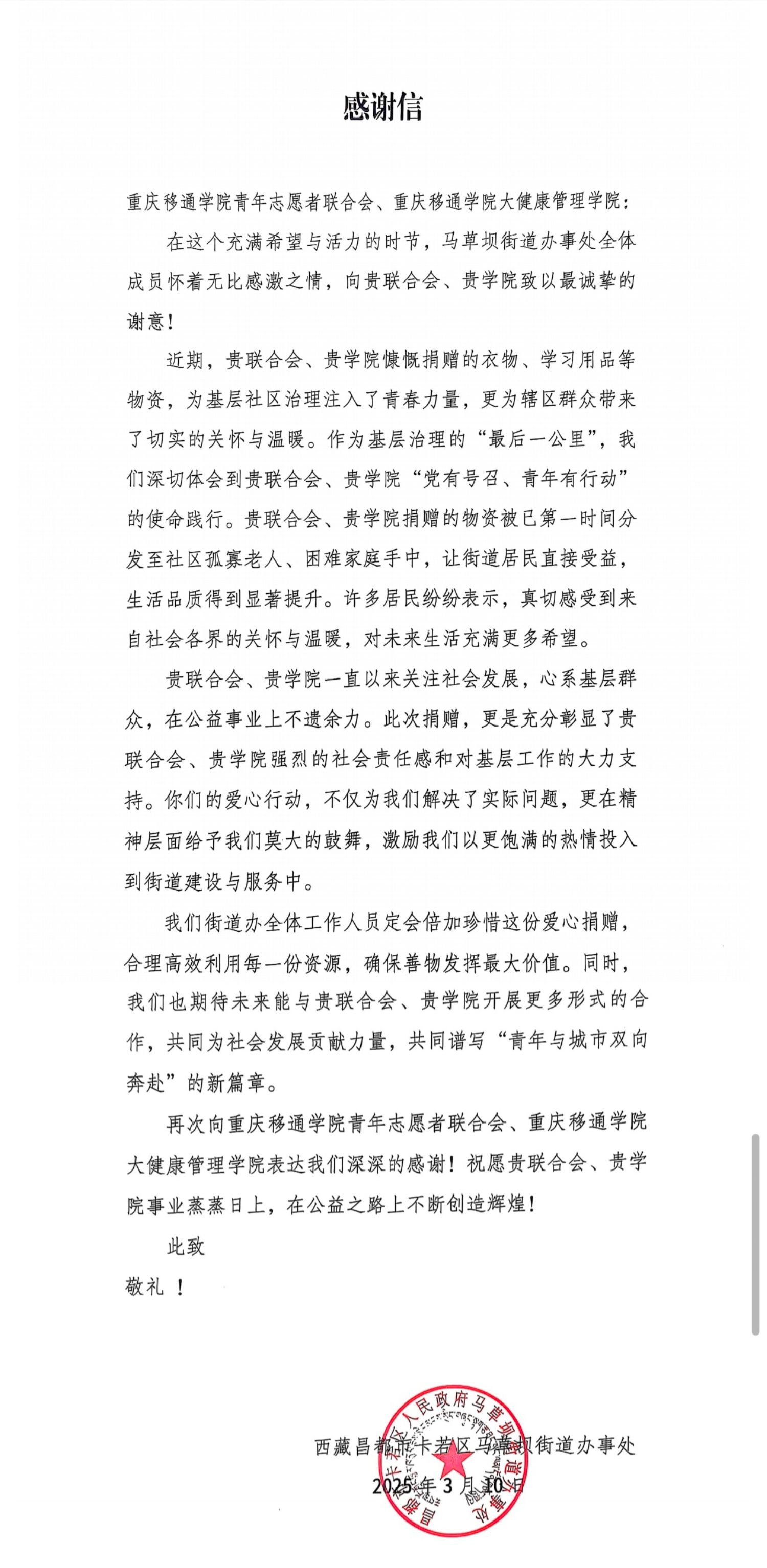 “感谢重庆移通学院的师生们,你们捐赠的衣物让我们的孩子们温暖过冬...”近日,一封来自西藏昌都市卡若区马草坝街道办事处的感谢信和裹着高原雪粒的锦旗跨越千山万水,送到了重庆移通学院綦江校区。大健康管理学院的同学们欣喜的说道:“这是一份来自2000公里外爱的惊喜!是孩子们对我们的回信!”这面穿越山河而来的锦旗,何尝不是雪域孩童寄来用哈达织就的拥抱?