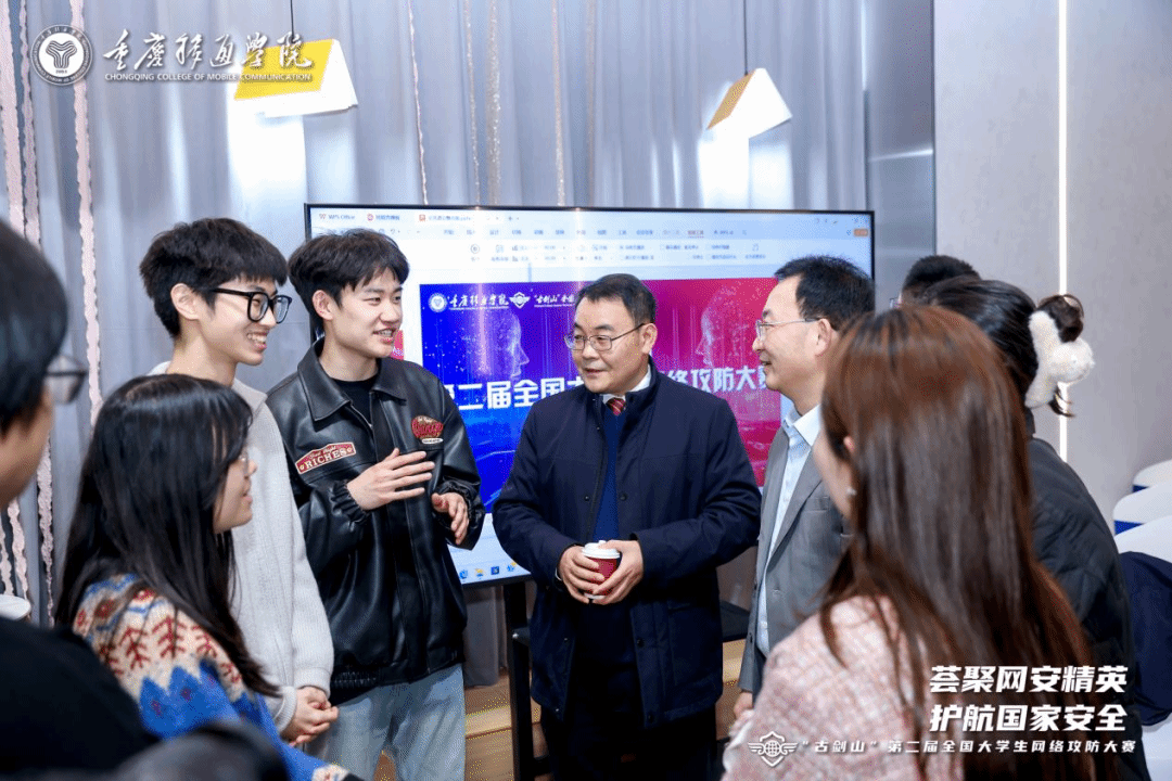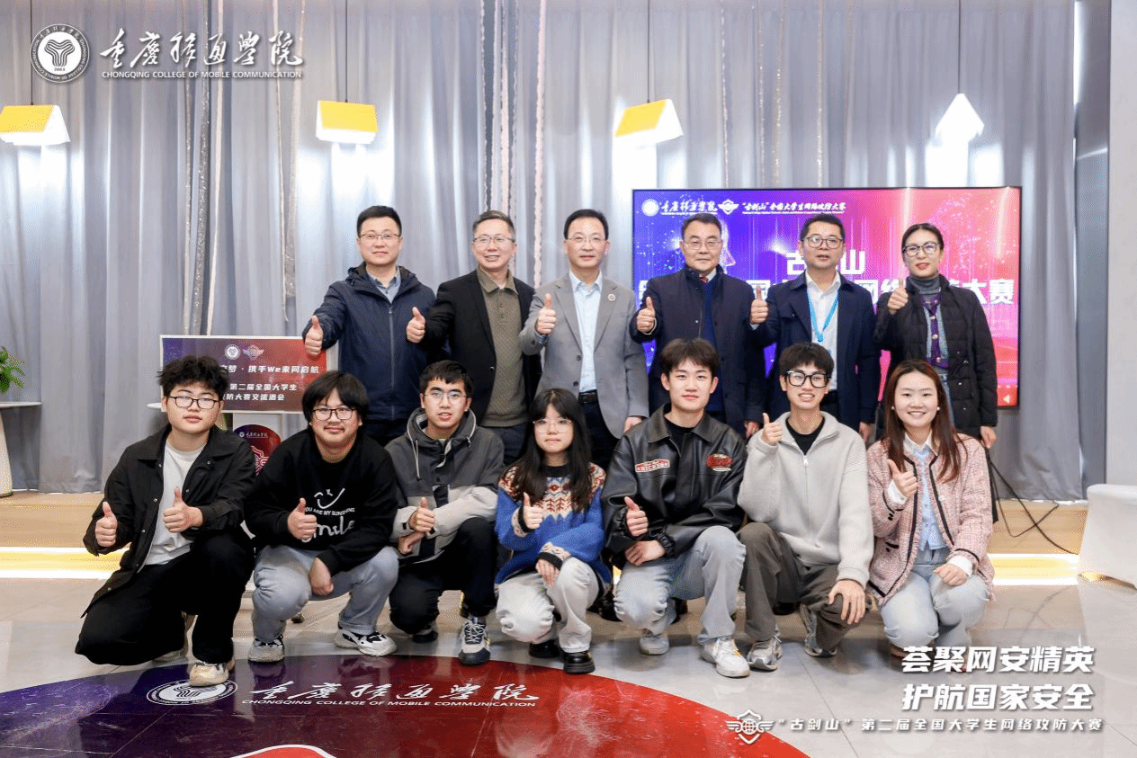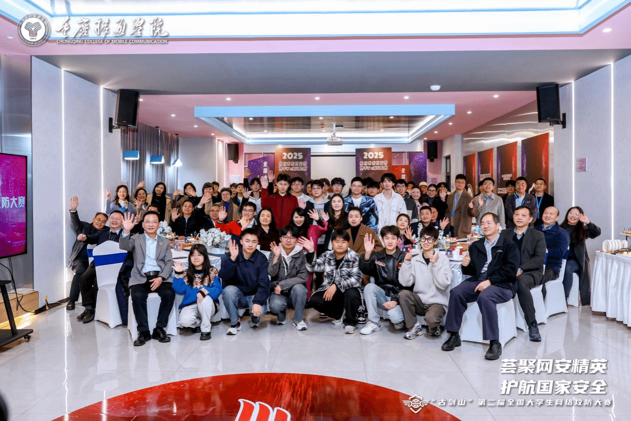 比赛结束后,指导老师及战队成员受邀参加交流酒会,来自全国各地的参赛师生、嘉宾以及各位领导齐聚一堂,共同分享网络安全领域的实践经验、前沿见解,探讨行业发展新趋势。重庆移通学院校长吕翊指出,本次大赛是积极响应国家战略号召、聚焦网络安全领域的重要举措,旨在为国家培养网络安全专业人才贡献力量。大赛精心搭建起优质平台,助力同学们提升网络安全技能,深度探索专业知识。吕翊校长表示,希望通过此次竞赛,进一步促进学校与企业间的深度合作,推动学术资源的广泛交流,真正的做到以赛促学,共同为网络安全事业的发展注入新的活力与动力。此次“綦剑网盾”战队的成功,正是学校特色办学体系下赛教融合成果的生动体现。