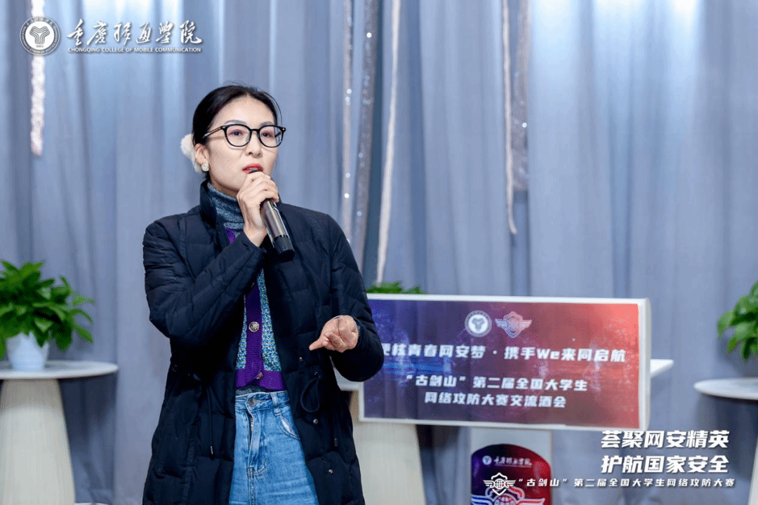 活动现场气氛热烈,大家围绕网络安全领域相关内容畅所欲言,毫无保留地分享着实践经验与前沿见解,诉说着各自在网络安全学习与探索途中的难忘经历。本届比赛中,作为首届大赛的参与者与见证者,“綦剑网盾1队”的指导教师崔向灵作为指导教师代表进行发言。她指出,在当下网络安全领域发展迅猛,技术迭代快,传统纯理论教学已无法满足行业需求,只有让学生置身于真实的网络安全场景中,经历各类实操项目的打磨,才能真正实现理论与实际操作的深度融合,培养实战性网络安全人才。我校綦剑网盾战队学生正是由我校四位一体双院制+完满教育这样的特色培养模式,从远景学院荣誉生中选拔出,再由网信中心通过技术实战的指导,取得了今天的成绩,突出了职能部门信息化管理育人以及以赛促学的创新性。