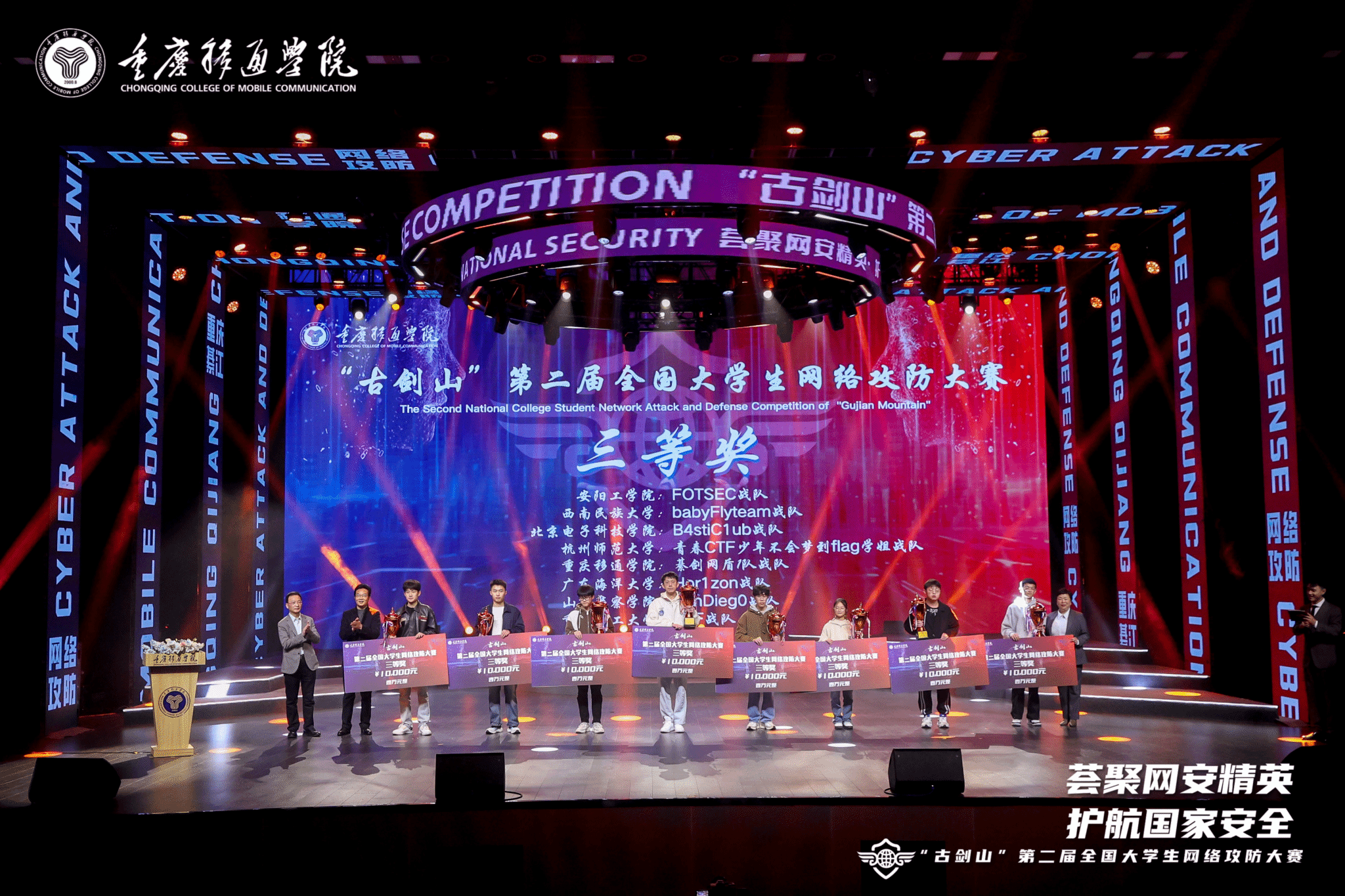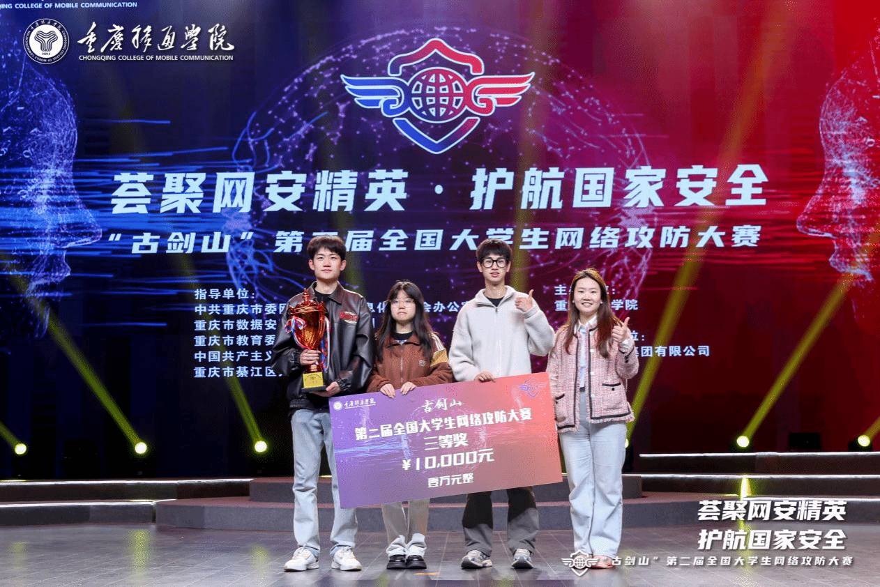 2025年3月29日上午,由中共重庆市委网络安全和信息化委员会办公室、重庆市教育委员会、重庆市綦江区人民政府指导,重庆移通学院主办,奇安信科技集团有限公司提供技术支持的“古剑山”第二届全国大学生网络攻防大赛决赛在重庆移通学院綦江校区成功举办。来自重庆移通学院綦江校区网络与信息管理中心攻防战队的綦剑网盾1队,一路披荆斩棘,在191所高校的1164支队伍中脱颖而出,蝉联全国三等奖。