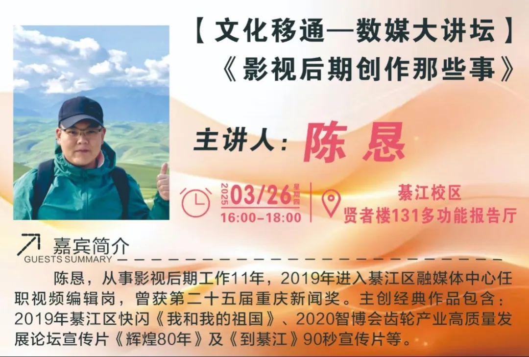 剪辑,能让冗长的镜头变得紧凑,让平淡的画面充满张力。2025年3月26日下午16:00,綦江区融媒体中心视频编辑陈恳老师,受邀于数字媒体产业学院,在重庆移通学院綦江校区贤者楼131多功能报告厅,为同学们带来了《影视后期创作那些事》主题讲座,带领同学们领略蒙太奇之美。