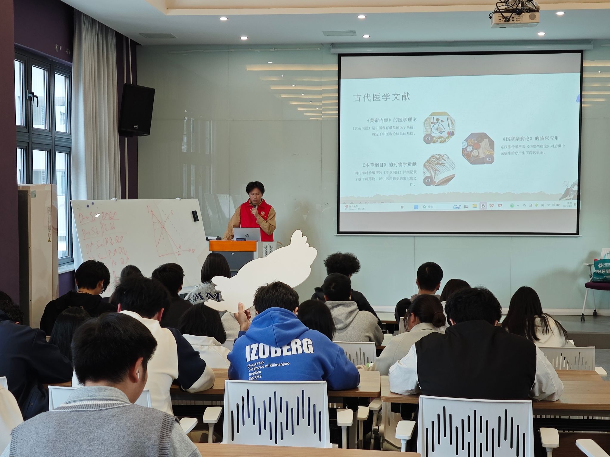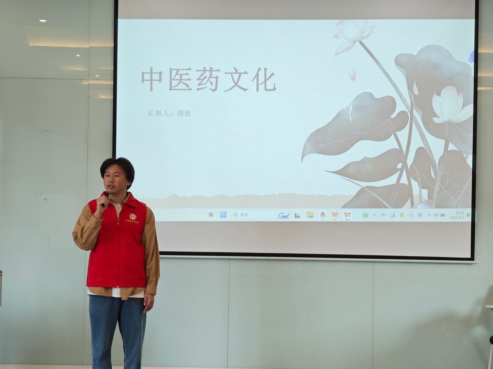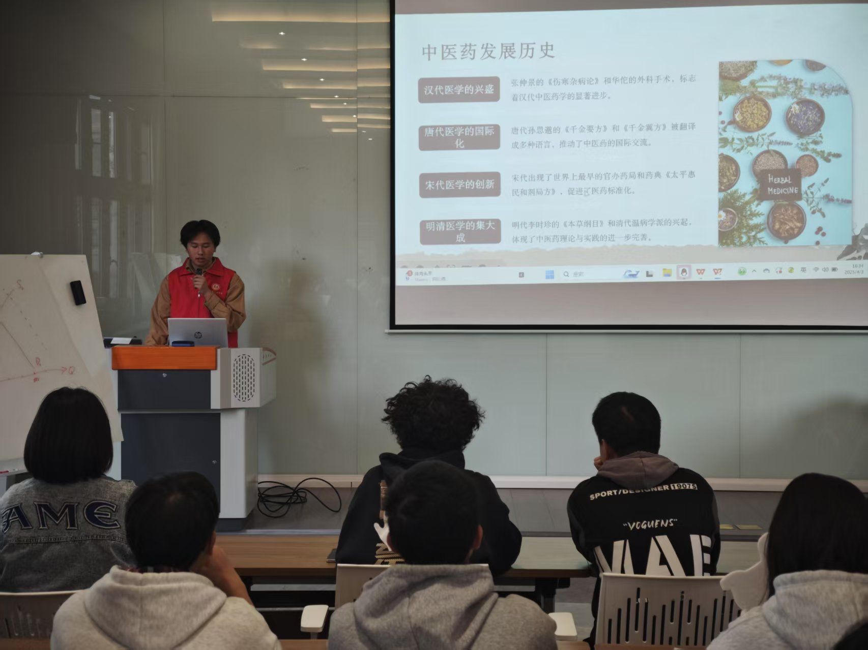 活动伊始,“向日葵”医护服务志愿服务专项支队队长周胜以生动的语言和丰富的案例,深入浅出地讲解了中医药的历史渊源、理论基础、常见中药材的功效及中医养生保健知识,让同学们对中医药有了更加全面、深入的了解。同学们聚精会神,在现场浓厚的求知氛围中,志愿者将中医药文化的深邃内涵,如涓涓细流般传递给每一位同学,带领大家领略传统医学的独特魅力。同学们的面庞上满是专注,在知识的传递中,展现出对健康知识的热切追求。
