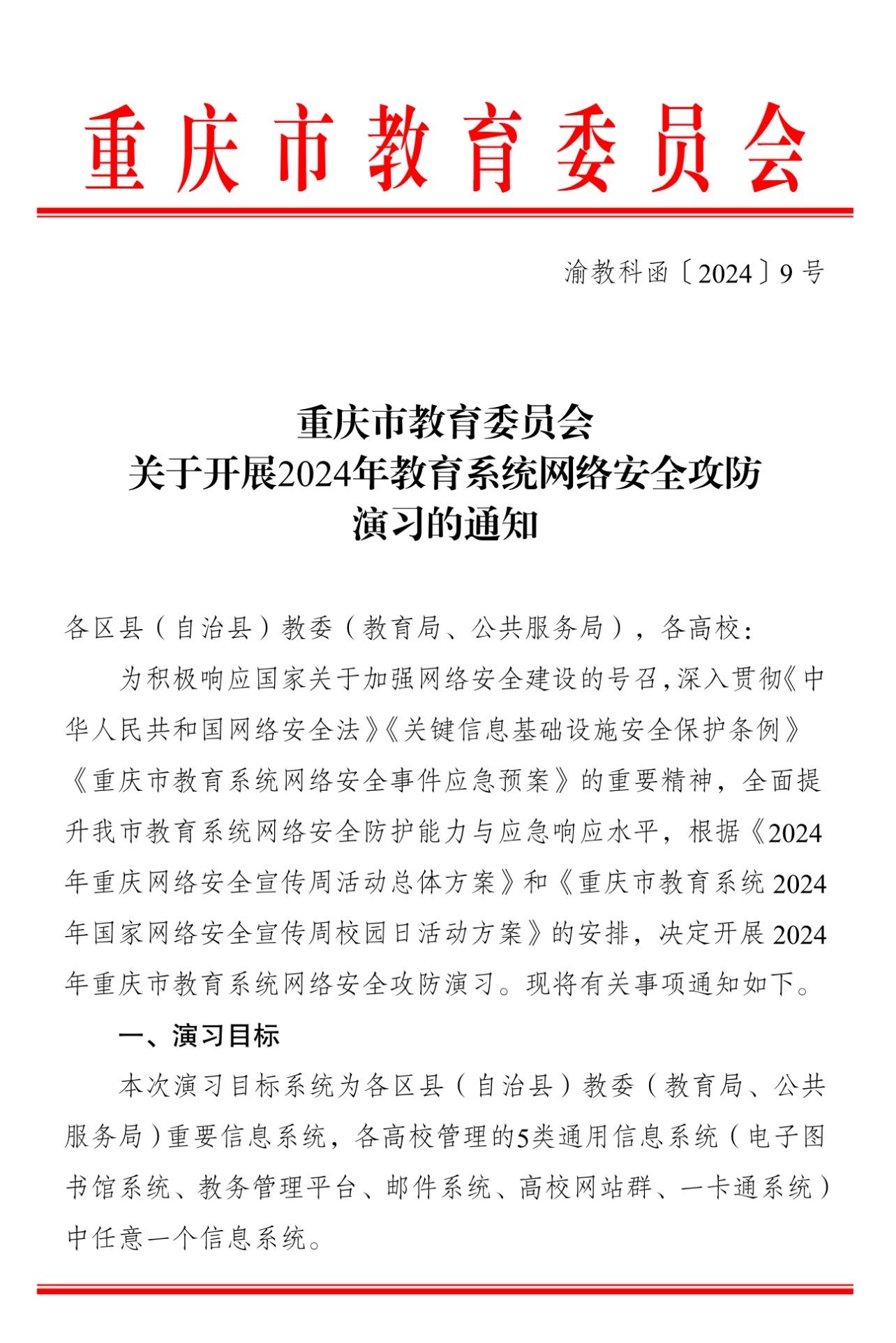 为积极响应国家关于加强网络安全建设的号召,深入贯彻《中华人民共和国网络安全法》《关键信息基础设施安全保护条例》《重庆市教育系统网络安全事件应急预案》的重要精神,重庆市教委于2024年9月9日至9月14日组织开展2024年重庆市教育系统网络安全攻防演习。