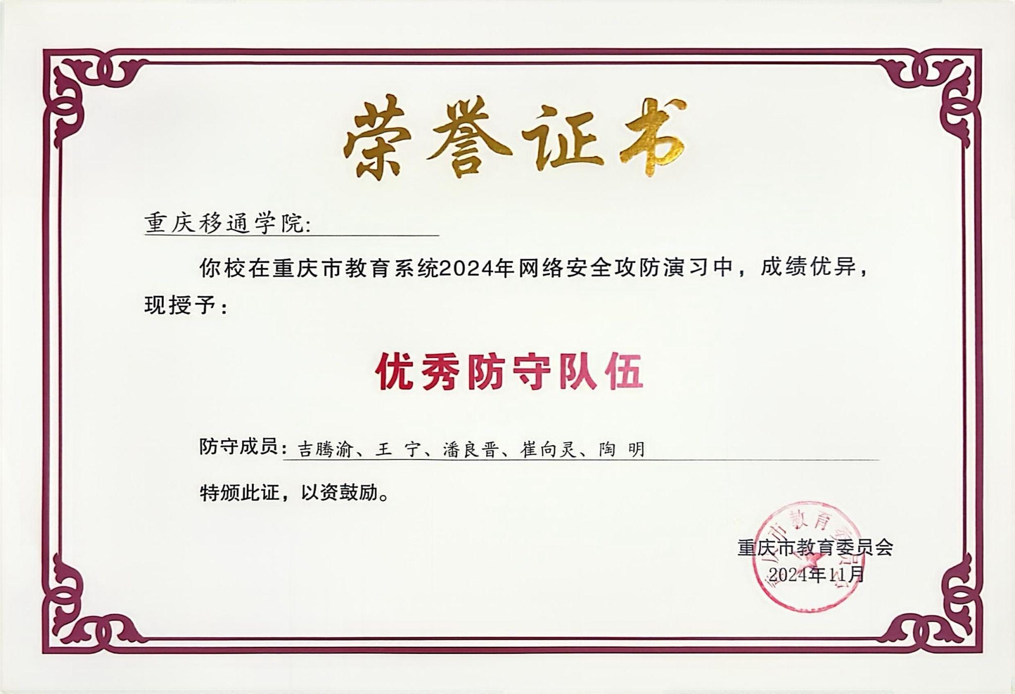 重庆移通学院作为防守方凭借完善的校园网络安全防御体系,在为期6天5夜的攻防演习中,从参与本次演习的109家单位、600余人中脱颖而出,并于近期,我校收到市教委颁发的 “优秀防守方” 单位荣誉证书。