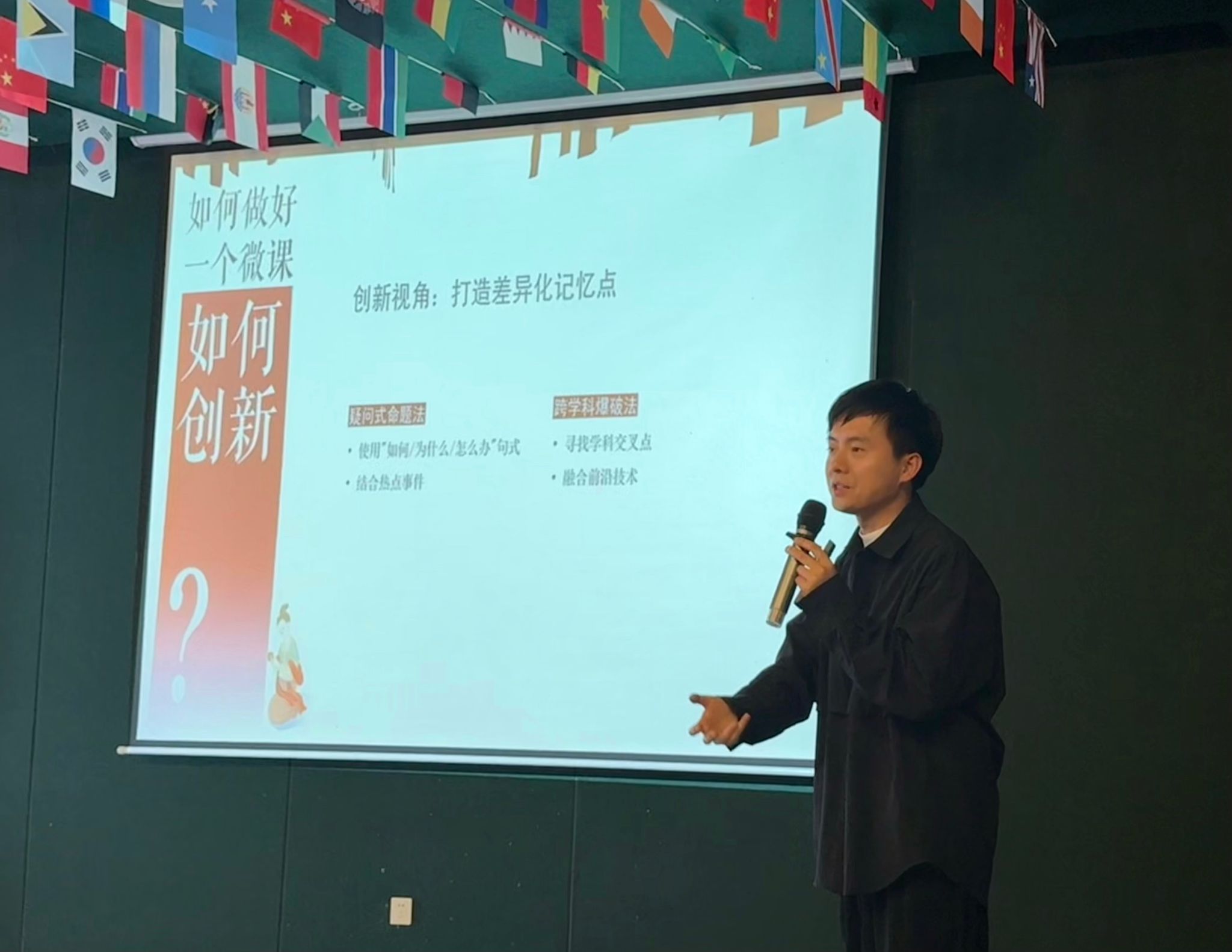 随后,秦琦琅老师以“如何做好一个微课”为题,围绕微课的策划思维、镜头语言、节奏控制和技术呈现等方面进行了全面讲解。他指出,一个优秀的微课不仅要内容精炼,还需在视觉语言中传递教学意图,体现教学理念与审美的高度统一。他还展示了多个微课实例,引发了教师们对“短视频时代教学表达方式”的深入思考。