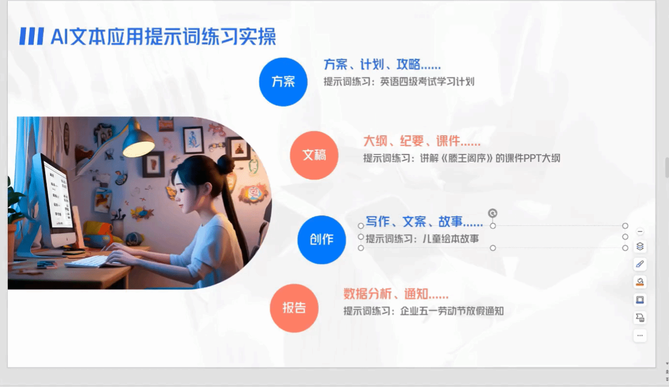 文本创作环节干货满满。讲师悉心传授AI文本创作技巧,强调提示词设定的关键意义。通过实际案例演示,指导学生如何优化提示词,从而获得贴合需求的文本内容。同时,深入阐述AI文本创作中的角色设定方法,从性格、背景、语言风格等多维度塑造角色,使创作内容特色鲜明、富有深度,为学生在内容创作领域打开新的思路。