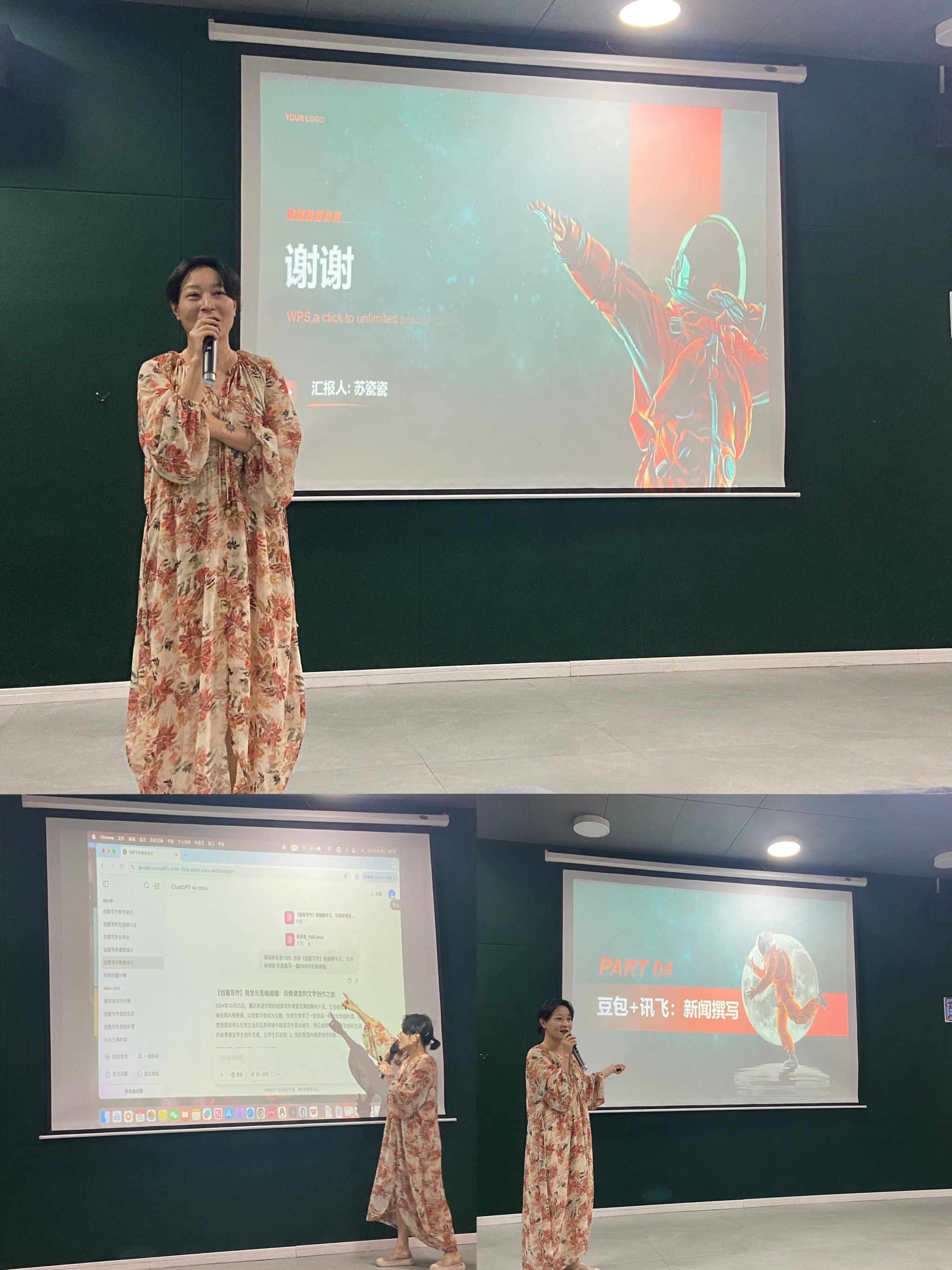 苏瓷瓷老师以“AI辅助《创意写作》备课的高效路径”为主题,系统演示了人工智能工具在教学中的应用:如智能文本生成,利用Chat GPT快速撰写教学大纲、教案等“教学三件套”;课件自动化,通过WPS AI一键生成结构化PPT,提升备课效率;可视化设计,借助Napkin工具将课程逻辑转化为直观路线图;新闻采编实践,结合“豆包+讯飞”工具完成新闻撰写训练。苏老师强调:“AI不是替代教师,而是解放创造力,让我们聚焦育人本质。”