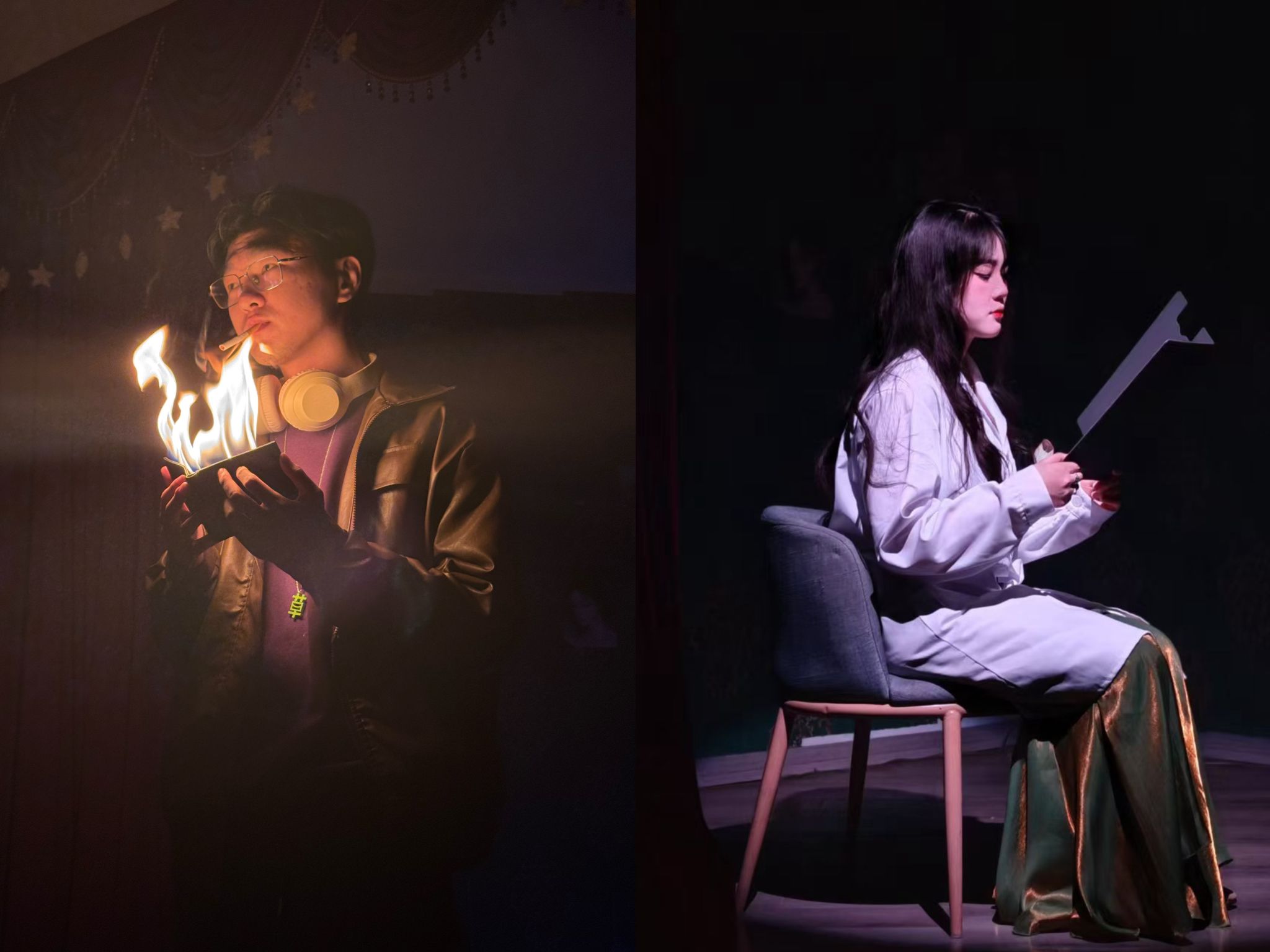 在体验完《流氓叙事》后,同学们就“DM控场、精进演绎、灯光音乐设计”等问题与“诡扯沉浸剧场”的优秀的DM进行了深入交流与学习,并以剧本《时光作渡》中"猴子"的演绎为教学案例。褪去夸张台词与程式化表演,主理人曾小峰通过微蜷的肢体语言与断续的喉音,将"猴子"从市井混混到最后痛失所爱的蜕变轨迹层层剥开。当他坐在椅子上反复摩挲相框时,所有人都读懂了角色内心的思念与痛苦。教学结束后,彭岩林同学上前尝试演绎了这一角色,其他同学也纷纷进行了不用角色的演绎展示,并得到店家专业指导,收获颇丰。