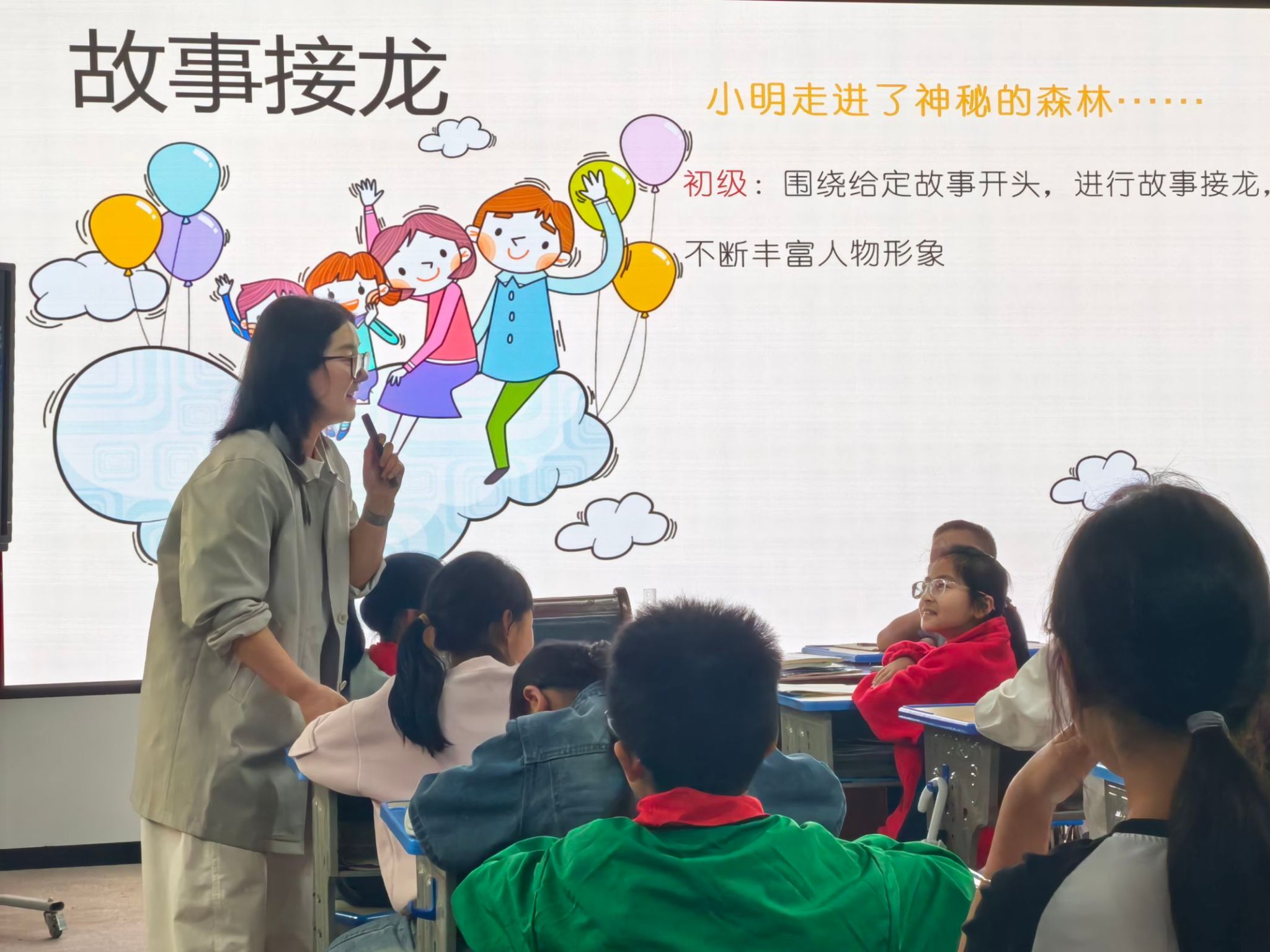 随后,在“故事接龙”环节,马静老师以“小明走进了神秘的森林”为开篇,引导学生们依次续写,并在续写过程中必须运用比喻或拟人手法。比如,有小朋友写道:“小明走进神秘的森林,他的眼睛里闪烁着好奇的光芒,像夜空中最亮的星。” 也有小朋友发挥想象,“森林里的小动物们像小精灵一样在跳跃”。比喻和拟人的恰当运用,让孩子们的文字充满了灵动与诗意。