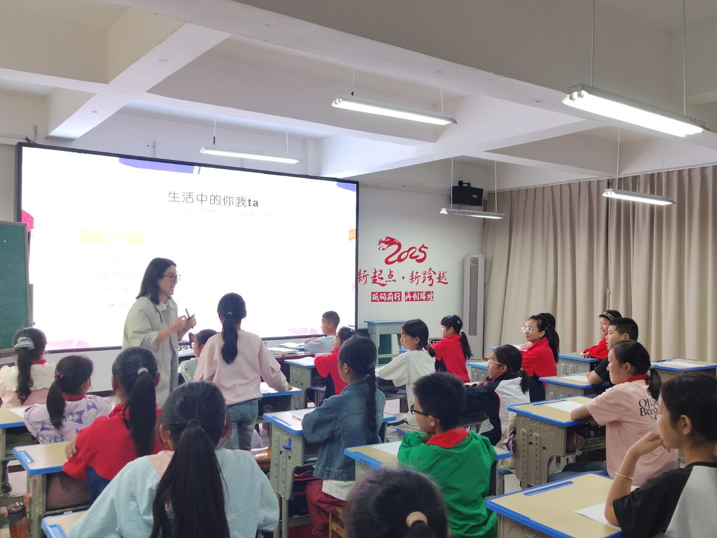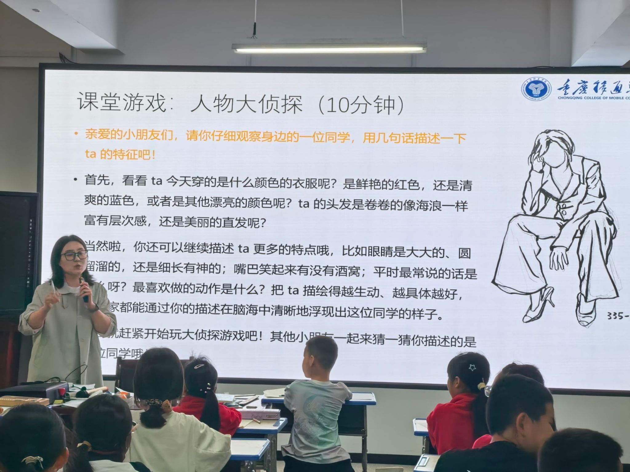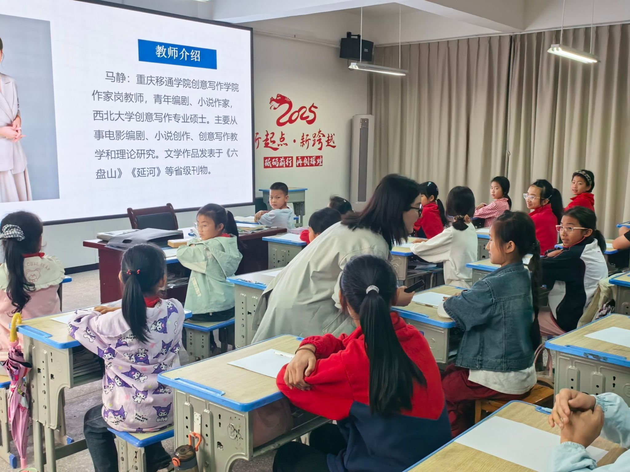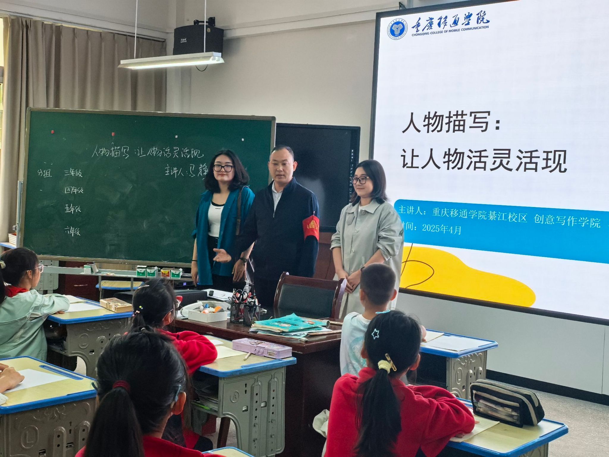 为落实重庆移通学院“教育教学三提三创”主题年活动方案,深入推进高校服务地方、促进基础教育发展的校际合作新模式,2025年4月24日下午,重庆移通学院綦江校区创意写作学院作家岗教师马静、殷文佳、王恒绩走进长乐小学。主讲老师马静为涵盖三至六年级的三十余名“写作、主持、演讲”兴趣班的学生,带来了一场题为《人物描写:让人物活灵活现》的写作课程。这堂生动有趣的写作公开课,标志着重庆移通学院与长乐小学的校际合作项目正式拉开序幕。“大学老师给我们上课,太好玩了。”一名三年级的女生跟她的班主任欣喜地报信。在90分钟里,课堂上始终保持高密度的师生互动方式,深深地打动了长乐小学兴趣班的孩子们。创意写作学院苏瓷瓷院长说,这只是创意写作学院与綦江四所中小学校际合作的第一站,与另外三所中学的课堂联动也将次第进行。