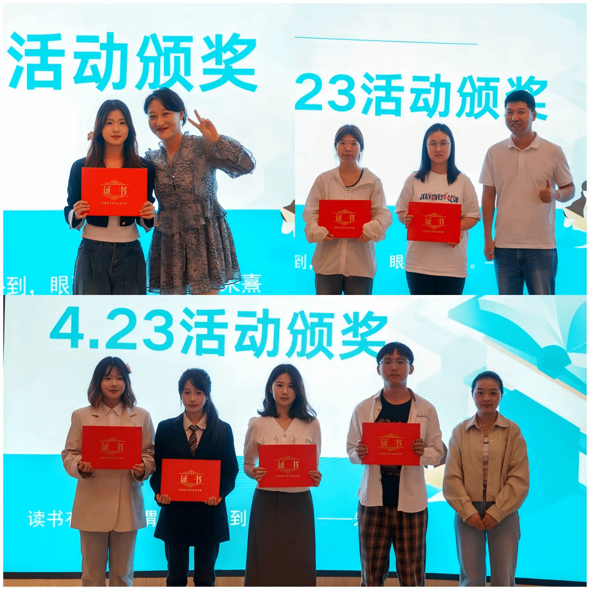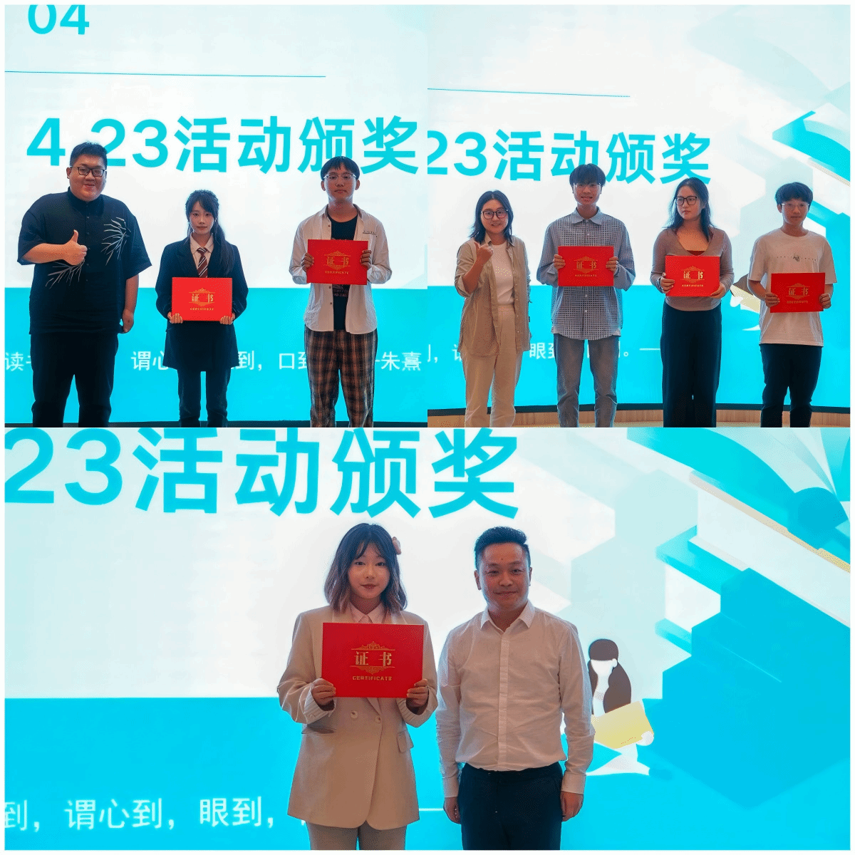 在宛转悠扬的朗读声中,本次“名人” 书籍荐读 PK 赛已步入尾声。为表彰在第30个世界读书日系列活动中表现优异的同学,引领更多人感受书香魅力,我们特别邀请了参与本次活动的领导嘉宾为在本次4.23系列阅读活动中获奖的同学们颁奖。希望他们在今后的阅读道路上,继续保持对阅读的热爱,不断探索知识的海洋。
