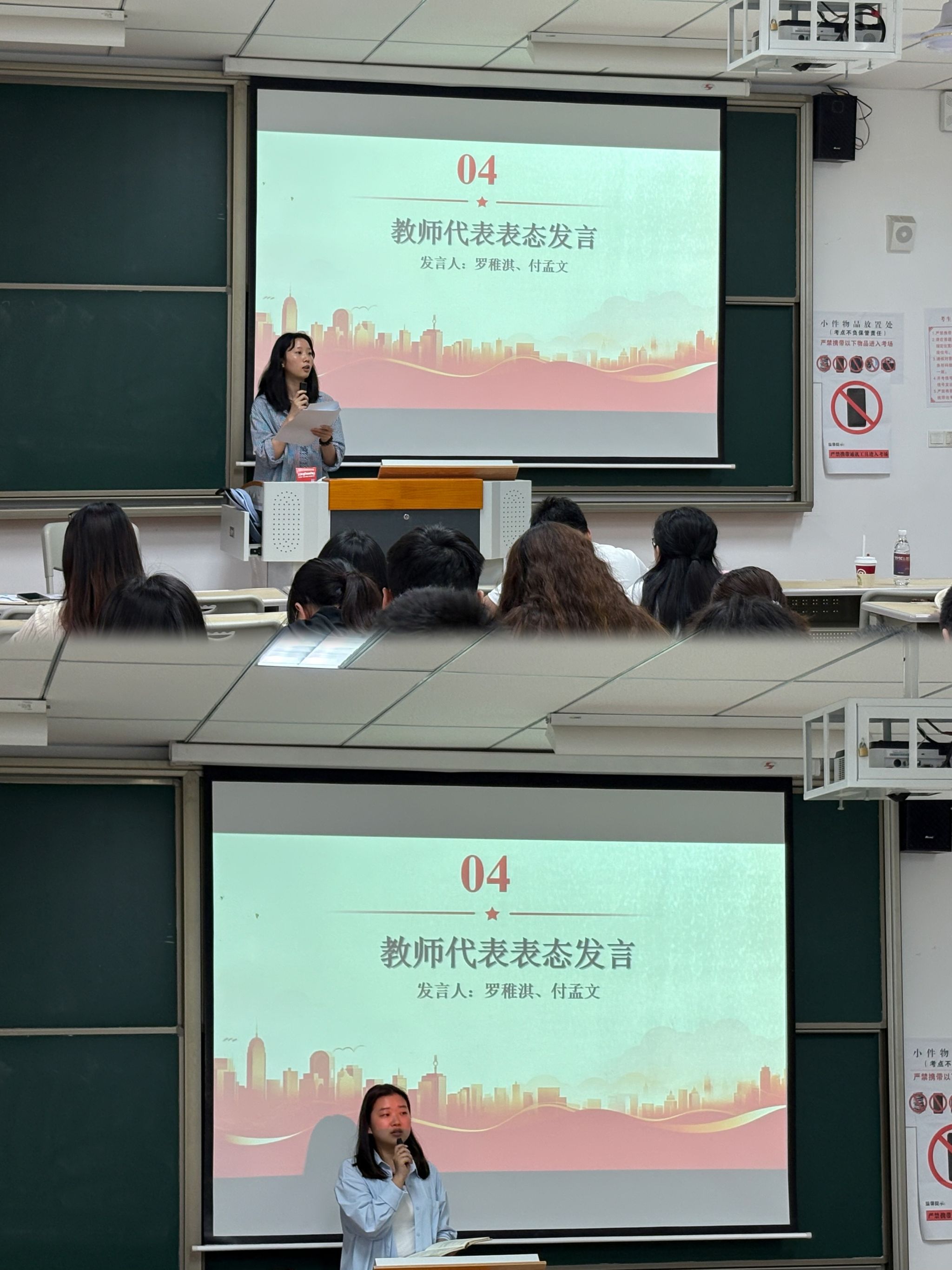 教师代表发言环节,教学教师代表罗稚淇老师分享了自己在教学过程中的经验和体会。罗老师表示:作为一名教师,要不断提升自己的教学水平,创新教学方法,激发学生的学习兴趣,引导学生积极主动地参与学习。同时,教师还要关注学生的成长需求,因材施教,为学生提供个性化的指导和帮助,助力学生成长成才。紧接着,辅导员教师代表付孟文老师则从学生管理的角度出发,强调了学风建设与学生日常管理的紧密联系。付老师表示:辅导员将加强与学生的沟通交流,及时了解学生的思想动态和学习情况,加强教学课堂检查以及宿舍查寝管理,培养良好的学习风气。