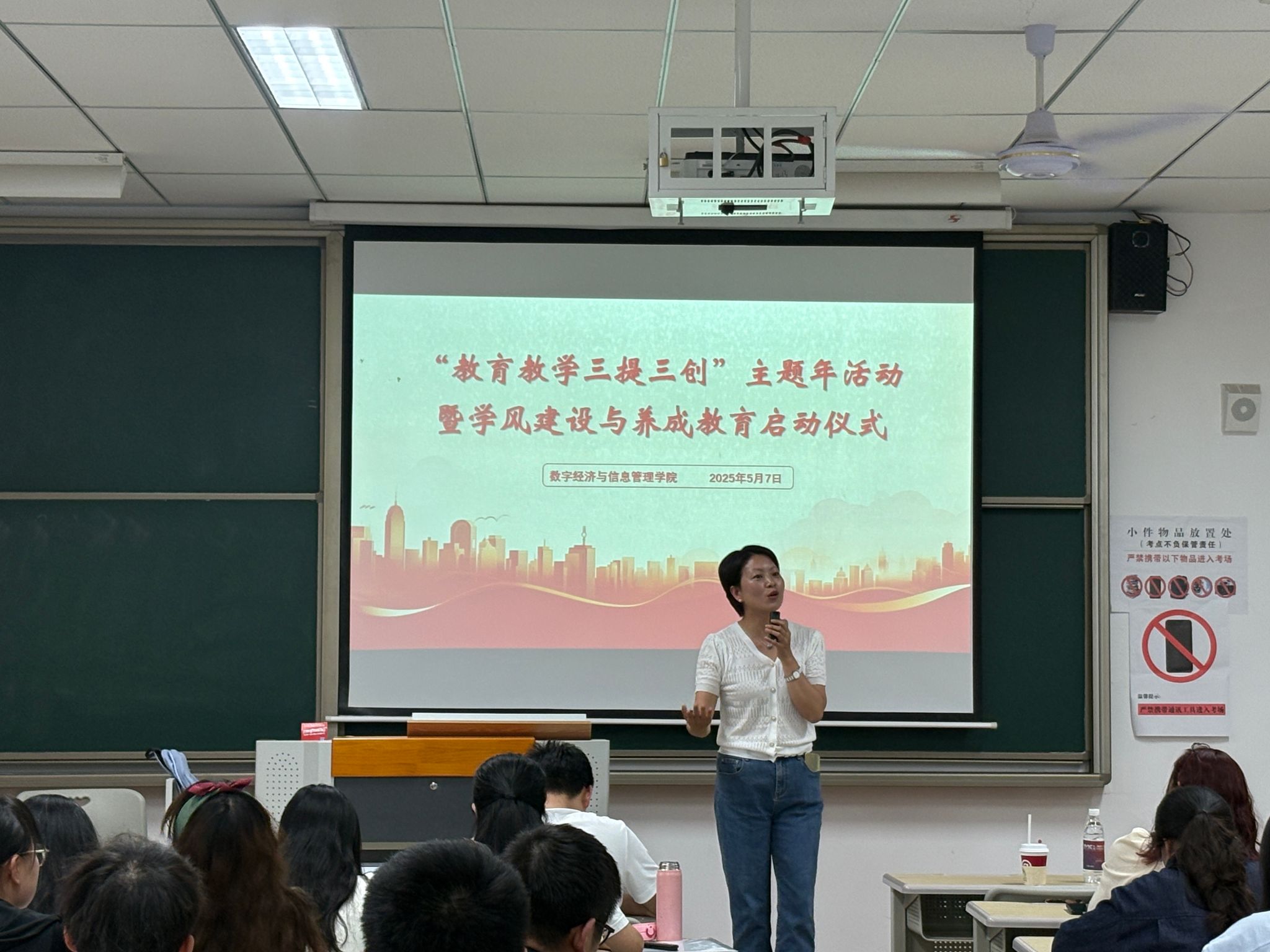 为进一步加强学院教育教学质量,增强学生“愿学”的主体意识,激发学生“好学”的内生动力,根据学校相关文件精神及实际情况,数字经济与信息管理学院于2025年5月7日16:00在仁者楼412教室举行了2025年“教育教学三提三创”—主题年活动暨学风建设养成教育启动仪式。学院全体教职工以及学生代表聚集在此,共同开启学院教育教学改革与学风建设的新篇章。本次活动由刘贵容院长主持。