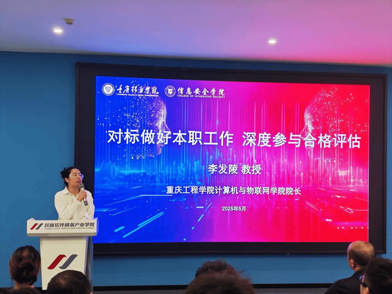 2025年5月7日,重庆移通学院信息安全学院邀请了重庆工程学院计算机与物联网学院院长、重庆市教育委员会信息化专家委员会专家李发陵教授进行了以《对标做好本职工作,深度参与合格评估》为主题的深度分享,为学院迎接评估工作提供宝贵经验与指导。信息安全学院院长王宁、代理教学副院长周小艳、学工副院长尹金维、各教研室和学工办主任及全体教职工参与此次会议。