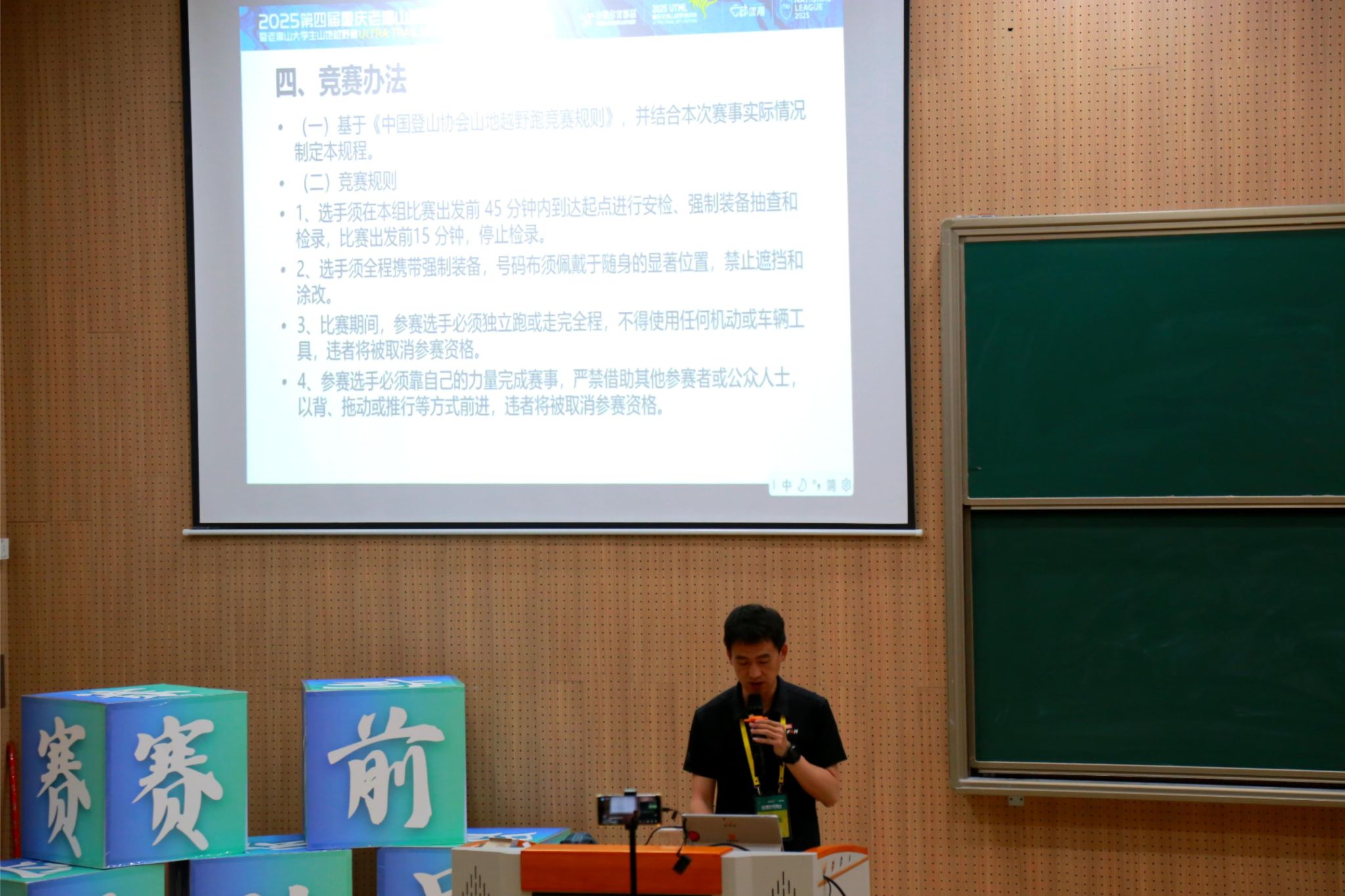 随后,赛事裁判长谢黄帅对本次比赛的各项细则进行了全面解读,涵盖比赛日程、起终点情况、竞赛规则、比赛计时及违规处罚等方面。他明确指出此次赛事计时方式精准透明,违规处罚采用累加制,以维护赛事公平公正。此外,裁判长还对赛道进行深入解析,对一些复杂和危险的地段给出了应对建议,助力选手以最佳状态迎接挑战。
