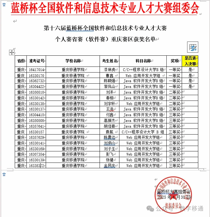 2025年4月12日9点,在合川和綦江校区举行第十六届“蓝桥杯”全国软件和信息技术专业人才大赛省赛(重庆移通学院赛点)。蓝桥杯一直致力于推动软件和信息技术领域的人才培养与产业发展,为行业选拔和输送了大量优秀人才。此次比赛由工业和信息化部人才交流中心作为主办单位,国信蓝桥教育科技股份有限公司承办组织。