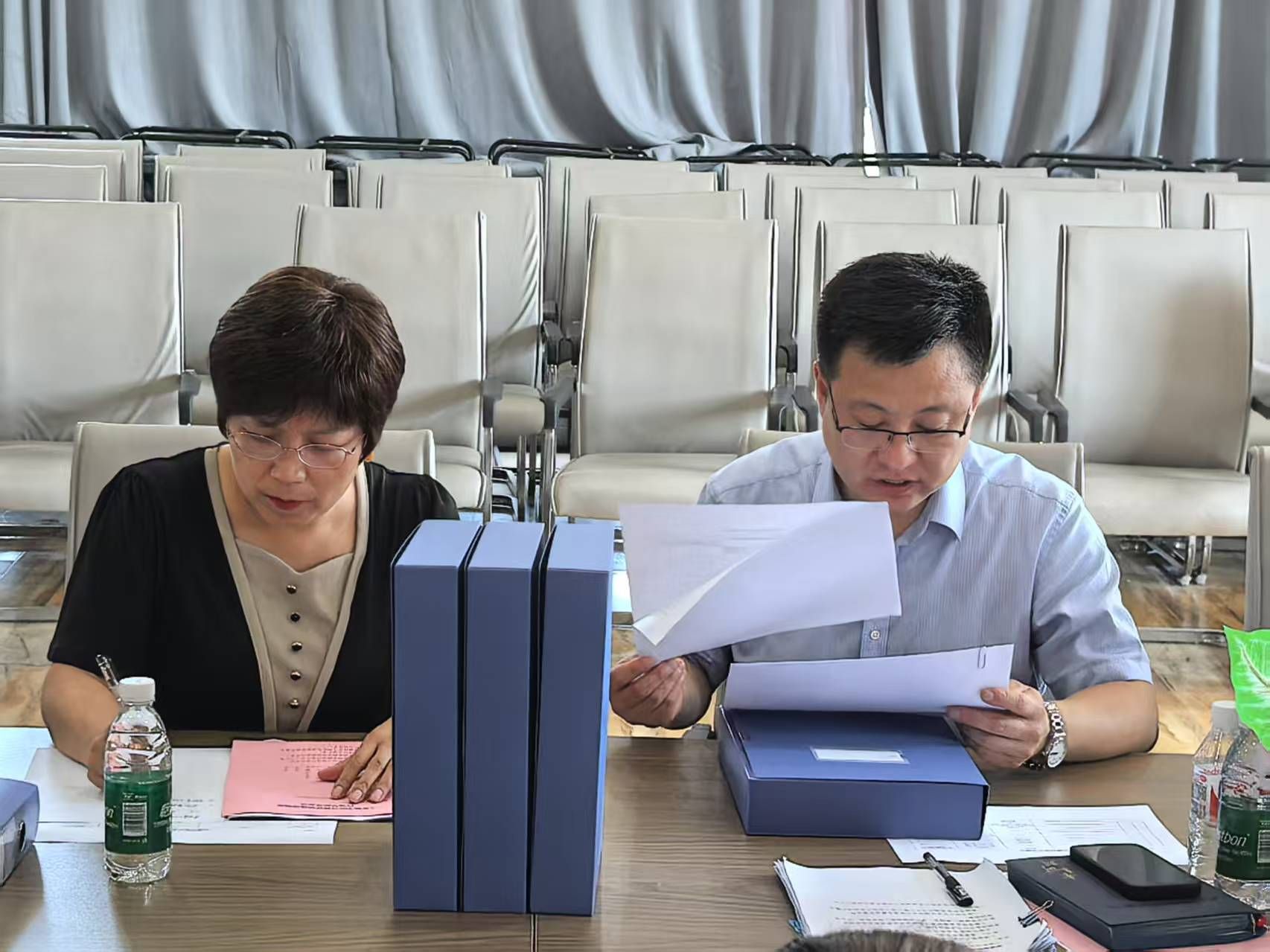 汇报结束后,进入材料检查环节。梁校助对学院合格评估材料进行细致审查,过程中不断提出建议,向院长、林院长等学院领导及时予以应答,并深入交流评估材料相关内容。