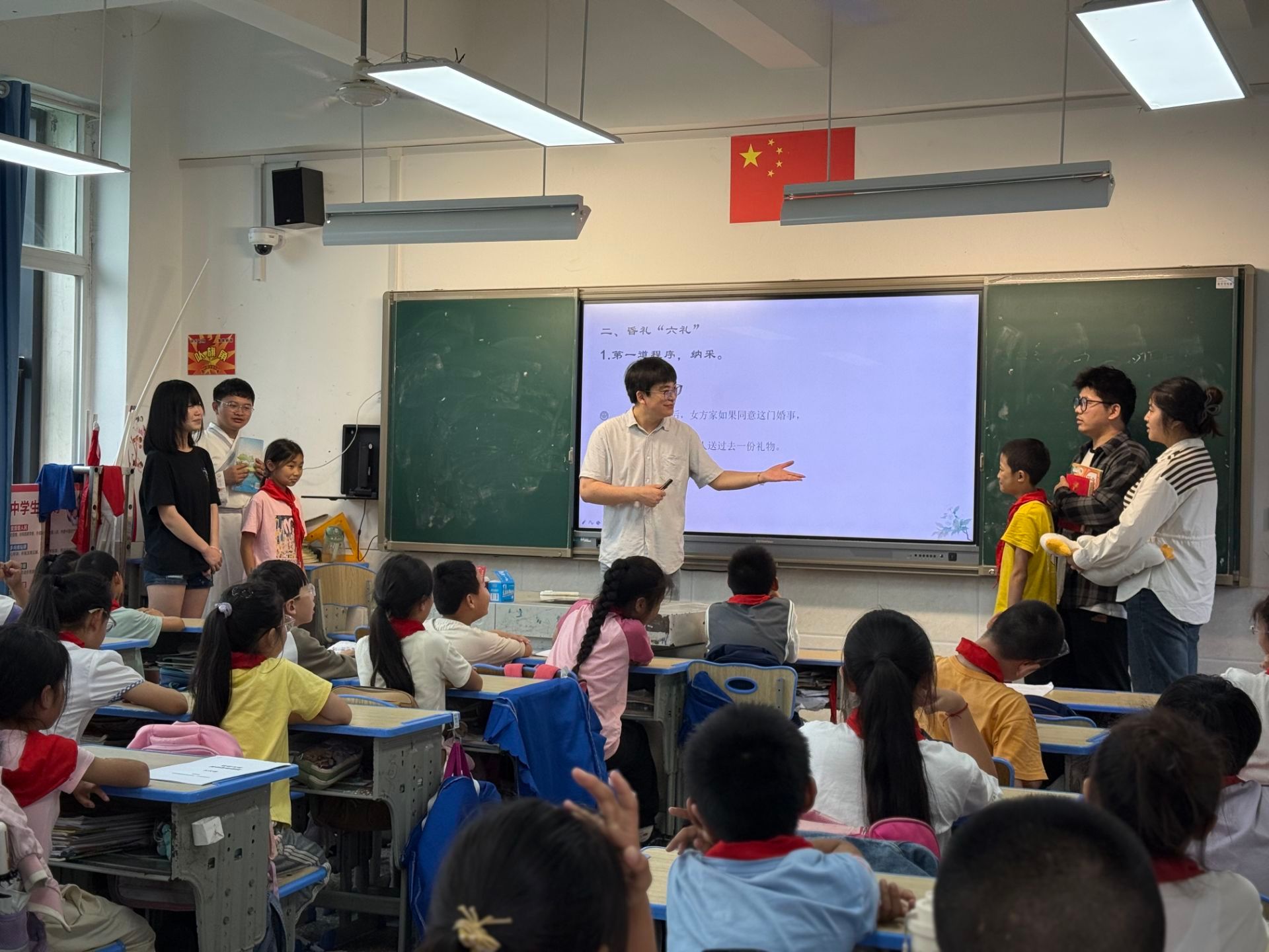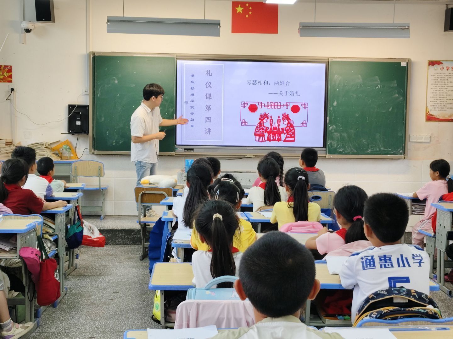 5月16日,移通学院通识教学部安朝东老师走进綦江通惠小学,为同学们带来了一场别开生面的国学课堂,这也是“国学进小学”活动的第4期。本次课堂以“古人的婚礼”为主题,通过多元教学形式,带领孩子们穿越时空,领略传统婚俗文化的独特魅力。